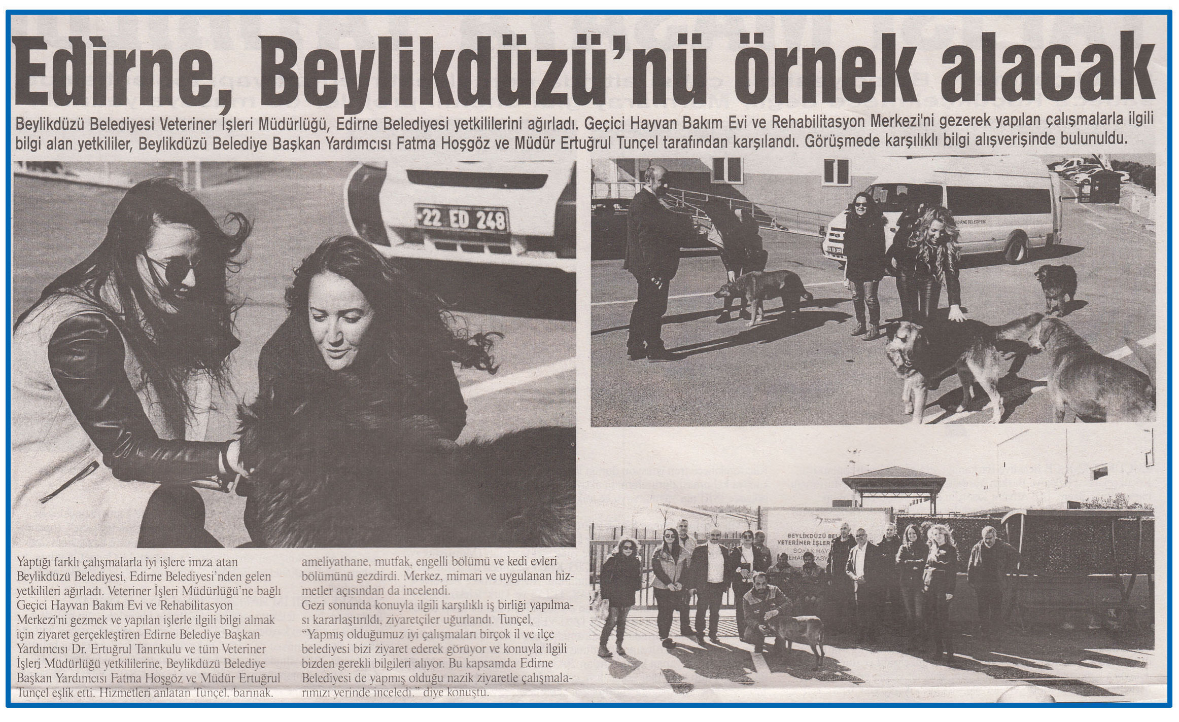 1 Mart 2017 tarihli "MARMARA" gazetesi. Beylikdüzü Belediyesi Veteriner İşleri Müdürlüğü, Edirne Belediyesi yetkililerini ağırladı. Geçici Hayvan Bakım Evi ve Rehabilitasyon Merkezi'ni gezerek yapılan çalışmalarla ilgili bilgi alan yetkililer, karşılıklı bilgi alışverişinde bulundu.