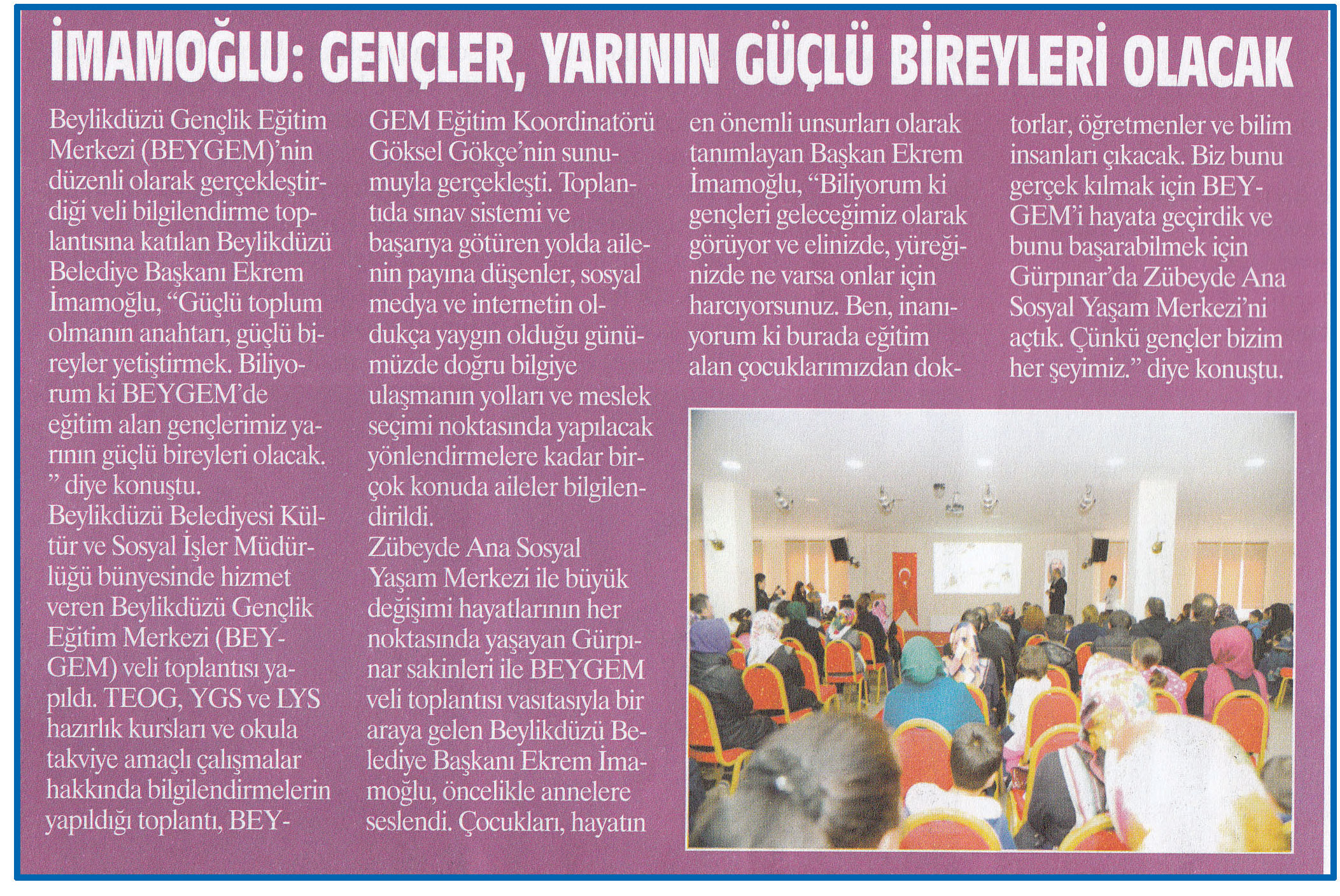 1 Mart 2017 tarihli "ZEYNA" gazetesi. Beylikdüzü Gençlik Eğitim Merkezi (BEYGEM)'nin düzenli olarak gerçekleştirdiği veli bilgilendirme toplantısına katılan Beylikdüzü Belediye Başkanı Ekrem İmamoğlu, " Güçlü toplum olmanın anahtarı, güçlü bireyler yetiştirmek. Biliyorum ki BEYGEM'de eğitim eğitim alan gençlerimiz yarının güçlü bireyleri olacak diye konuştu.