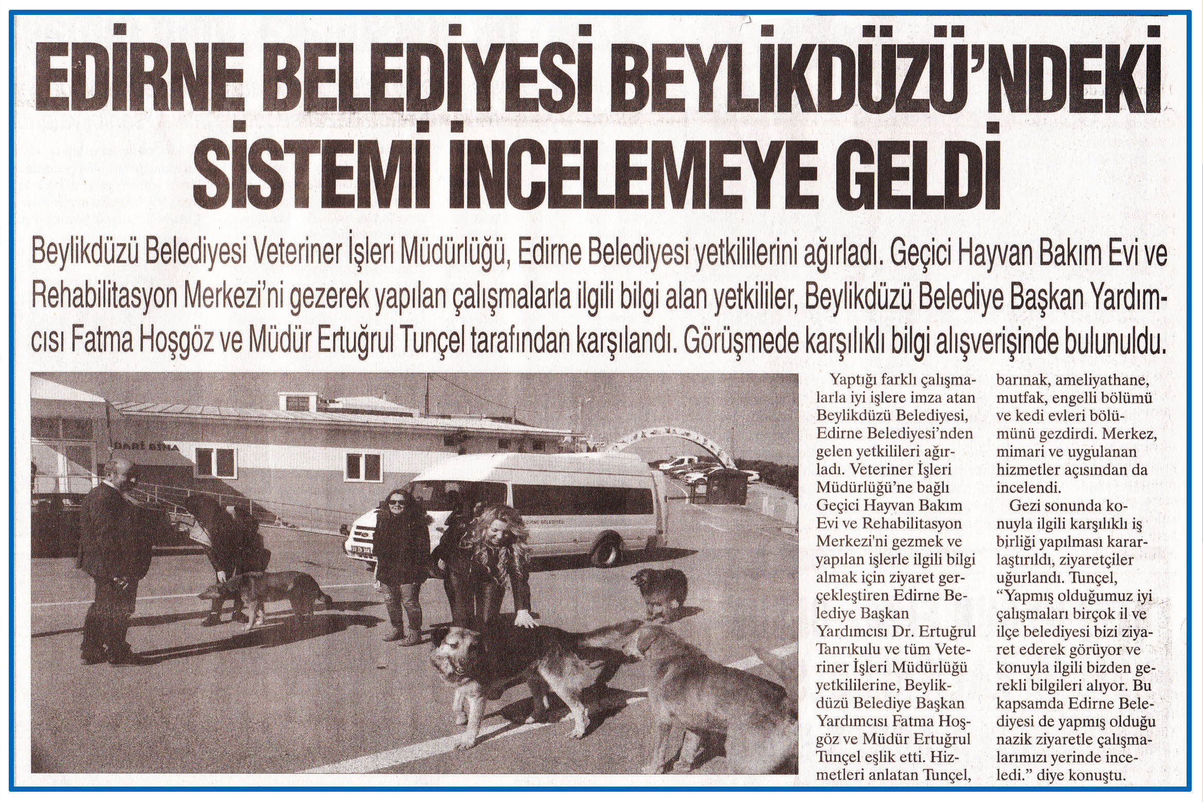 2 Mart 2017 tarihli "BÜYÜKÇEKMECE" gazetesi. Beylikdüzü Belediyesi Veteriner İşleri Müdürlüğü, Edirne Belediyesi yetkililerini ağırladı. Geçici Hayvan Bakım Evi ve Rehabilitasyon Merkezi'ni gezerek yapılan çalışmalarla ilgili bilgi alan yetkililer, Beylikdüzü Belediye Başkan Yardımcısı Fatma Hoşgöz ve Müdür Ertuğrul Tunçel tarafından karşılandı. Görüşmede karşılıklı bilgi alışverişinde bulunuldu.