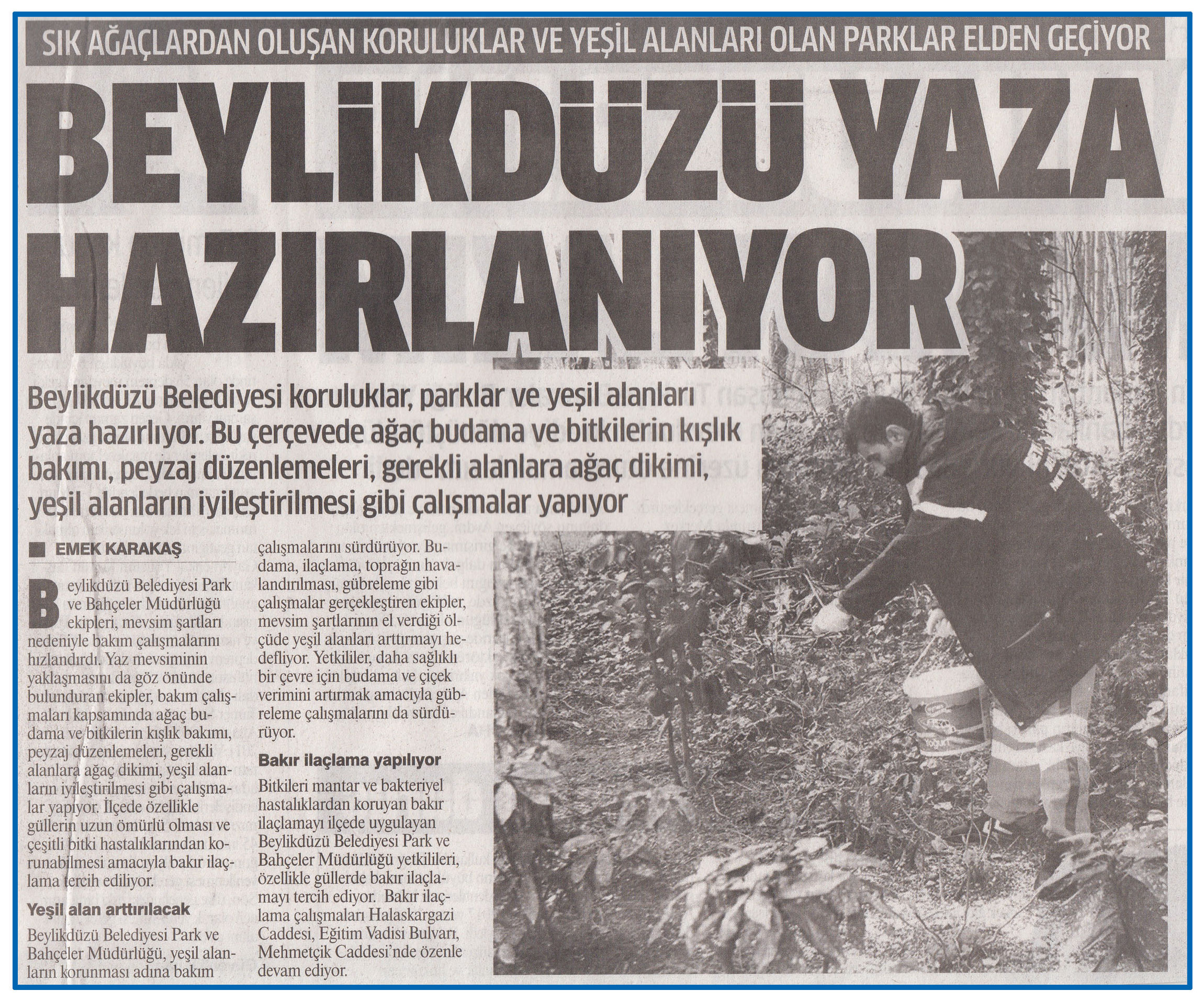 2 Mart 2017 tarihli "GAZETEM İSTANBUL" gazetesi. Beylikdüzü Belediyesi Park ve Bahçeler Müdürlüğü, yeşil alanların korunması adına bakım çalışmalarını sürdürüyor. Budama, ilaçlama, toprağın havalandırılması, gübreleme gibi çalışmalar gerçekleştiren ekipler, mevsim şartlarının el verdiği ölçüde yeşil alanları arttırmayı hedefliyor.