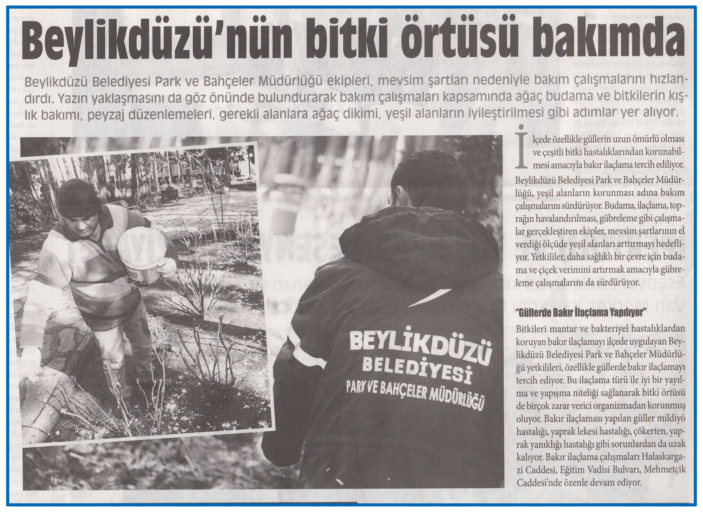 2 Mart 2017 tarihli "HABERCİ" gazetesi. Beylikdüzü Belediyesi Park ve Bahçeler Müdürlüğü ekipleri, mevsim şartları nedeniyle bakım çalışmalarını hızlandırdı. Yazın yaklaşmasını da göz önünde bulundurarak bakım çalışmaları kapsamında ağaç budama ve bitkilerin kışlık bakımı, peyzaj düzenlemeleri, gerekli alanlara ağaç dikimi, yeşil alanların iyileştirilmesi gibi adımlar yer alıyor.