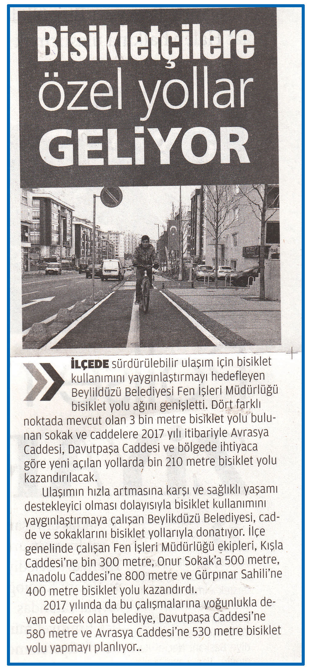 2 Ocak 2017 tarihli YENİ GÜN gazetesi. Beylikdüzü Belediyesi Fen İşleri Müdürlüğü ilçede bisiklet kullanımını teşvik etmek için mevcut 3000 metre olan bisiklet yoluna 1210 metre bisiklet yolu daha kazandırmak için çalışmalara başladı. 2017 yılı itibarıyla Avrasya caddesi ,Davutpaşa caddesi ve bölgede ihtiyaca göre yeni bisiklet yolları kazandırılacak.