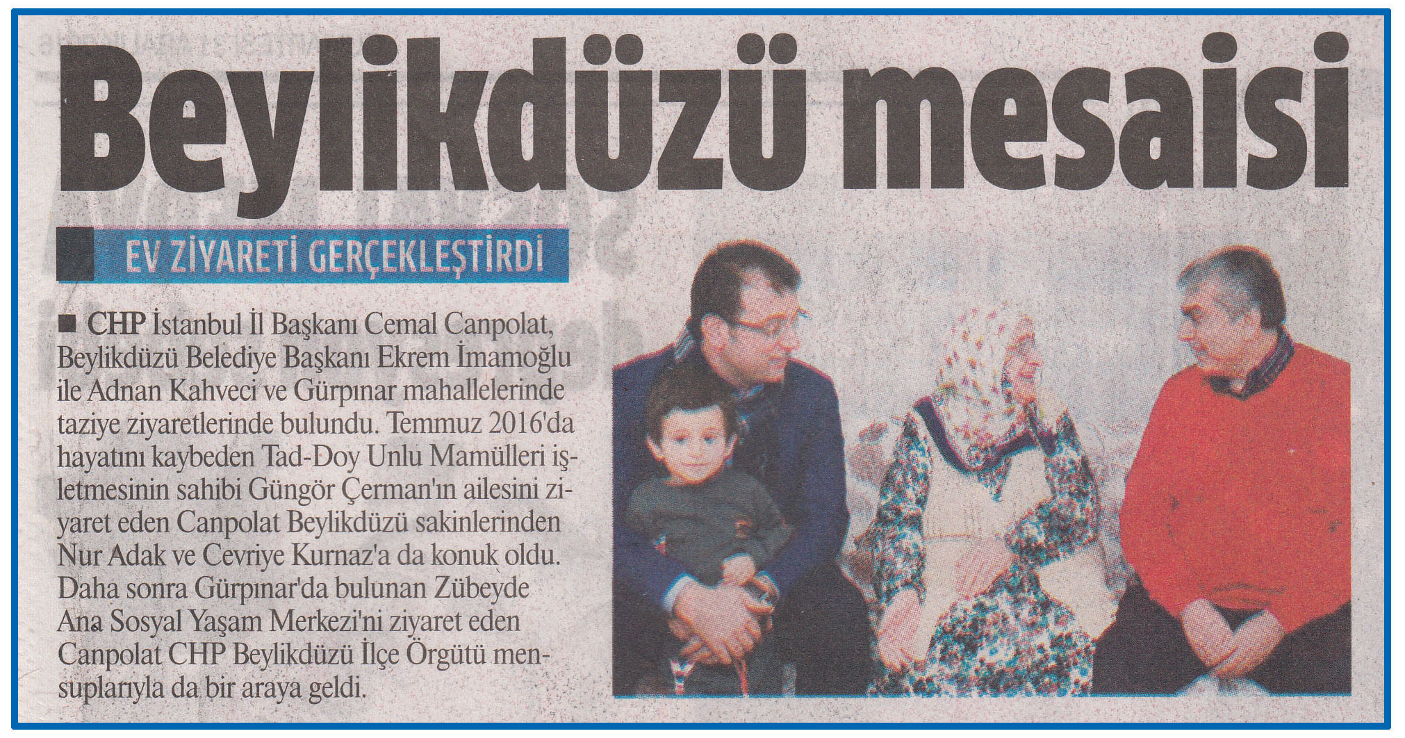 2 Ocak 2017 tarihli GAZETEM İSTANBUL gazetesi. CHP İstanbul İl Başkanı Cemal Canpolat, Beylikdüzü Bld. Bşk. Ekrem İmamoğlu Adnan Kahveci ve Gürpınar mahallelerinde taziye ziyaretlerinde bulundular
