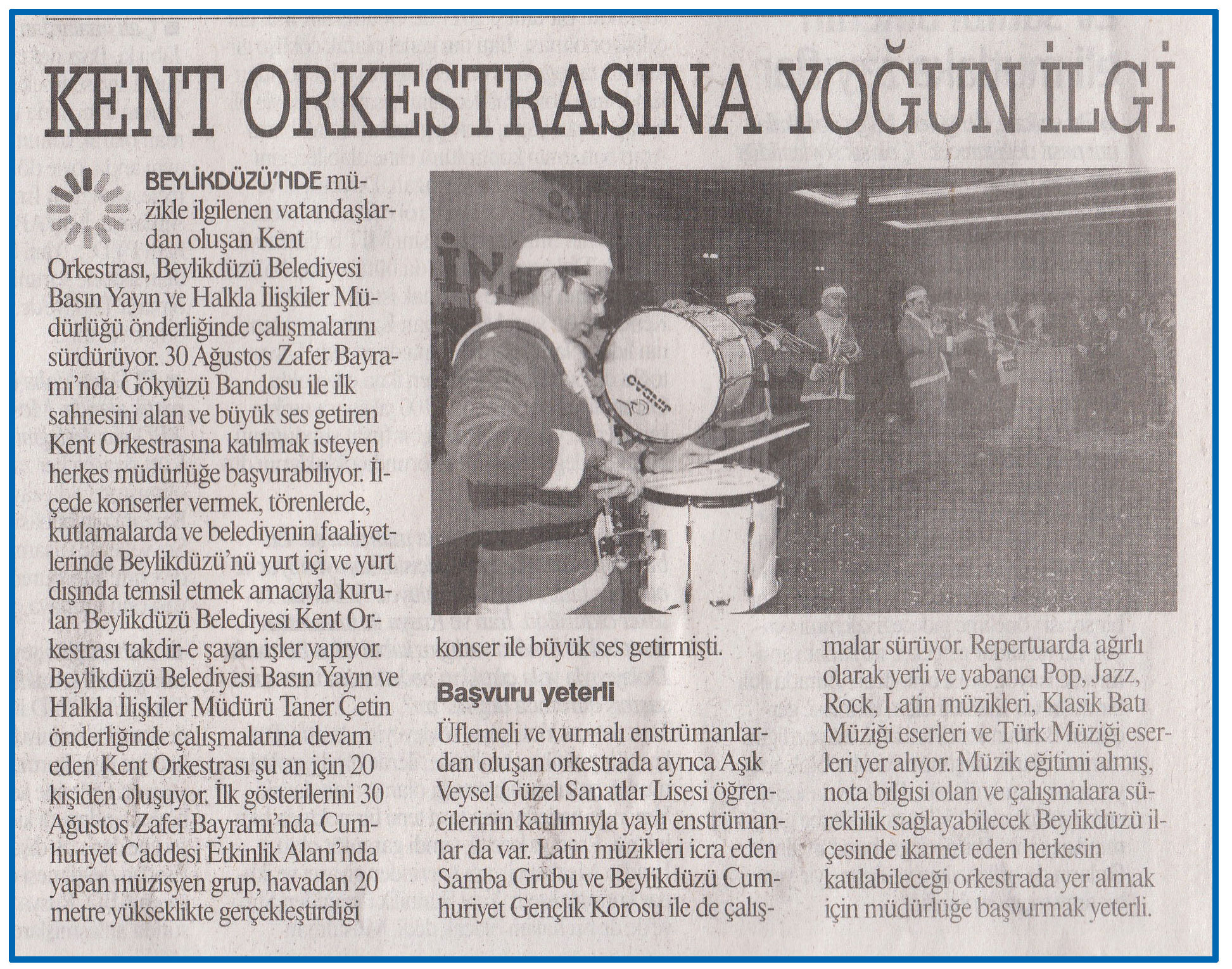 2 Ocak 207 tarihli "GAZETEM İSTANBUL" gazetesi. 30 Ağustos Zafer Bayramı'nda Gökyüzü Bandosu ile büyük ses getiren Kent Orkestrası Beylikdüzü Belediyesi Basın Yayın ve Halkla İlişkiler Müdürlüğü önderliğinde çalışmalarını sürdürüyor.Beylikdüzü'nde yaşayan kent sakinlerinin yoğun ilgi gösterdiği Kent Orkestrası'na katılmak isteyen herkes müdürlüğe başvurabiliyor.