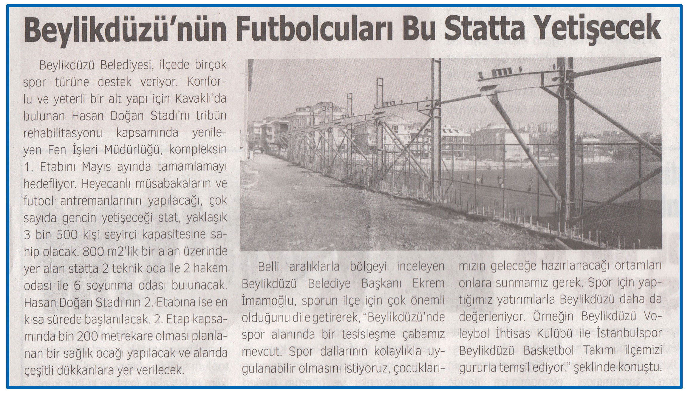 3 Mart 2017 tarihli "SES" gazetesi. Beylikdüzü Belediyesi, Kavaklı'da bulunan Hasan Doğan Stadı'nı tribün rehabilitasyonu kapsamında yenileyen Fen İşleri Müdürlüğü, kompleksin 1. Etabını Mayıs ayında tamamlamayı hedefliyor.Çok sayıda gencin yetişeceği stat, yaklaşık 3 bin 500 kişi seyirci kapasitesine sahip olacak.