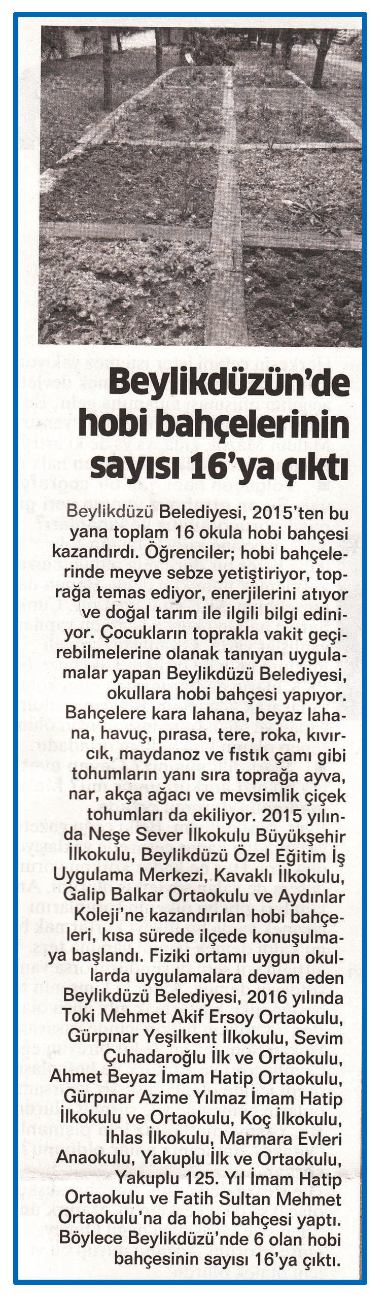 2 Ocak 2017 tarihli "YENİGÜN" gazetesi. Beylikdüzü Belediyesi, çocukların doğayı tanımaları, toprağı tanıyıp meyve-sebze yetiştirmeleri ve enerjilerini atmaları için hayata geçirdiği hobi bahçelerinin sayısı 16'ya ulaştı.2015 yılında bu yana devam eden projeye çocuklarında ilgiside yoğun oldu.