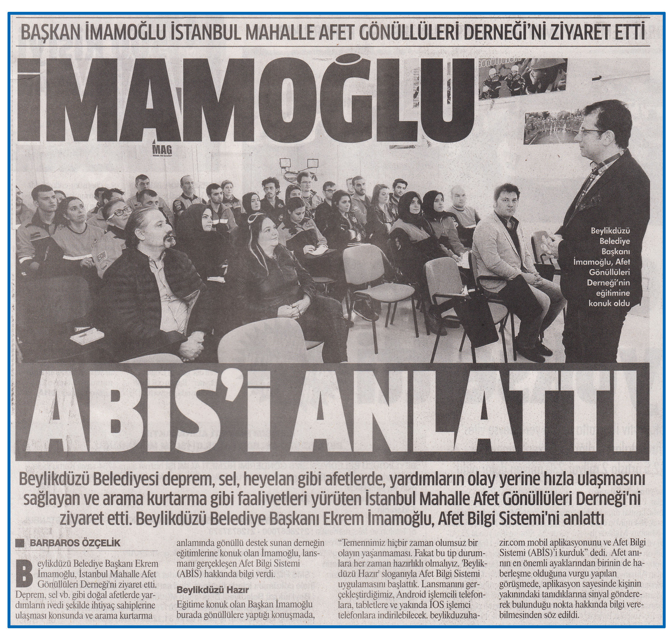 6 Mart 2017 tarihli "GAZETEM İSTANBUL" gazetesi. Beylikdüzü Belediyesi deprem, sel, heyelan gibi afetlerde, yardımların olay yerine hızla ulaşmasını sağlayan ve arama kurtarma gibi faaliyetleri yürüten İstanbul Mahalle Afet Gönüllüleri Derneği'ni ziyaret etti. Beylikdüzü Belediye Başkanı Ekrem İmamoğlu, Afet Bilgi Sistemi'ni anlattı.