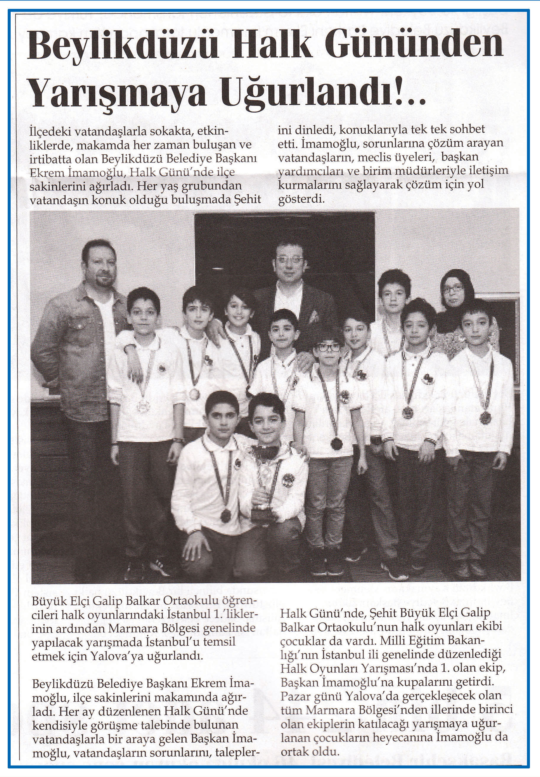 7 Mart 2017 tarihli "HÜRBAKIŞ" gazetesi. Beylikdüzü Belediye Başkanı Ekrem İmamoğlu, Halk Günü'nde ilçe sakinlerini ağırladı. Her yaş grubundan vatandaşın konuk olduğu buluşmada Şehit Büyük Elçi Galip Balkar Ortaokulu öğrencileri halk oyunlarındaki İstanbul 1. liklerinin ardından Marmara Bölgesi genelinde yapılacak yarışmada İstanbul'u temsil etmek için Yalova'ya uğurlandı.