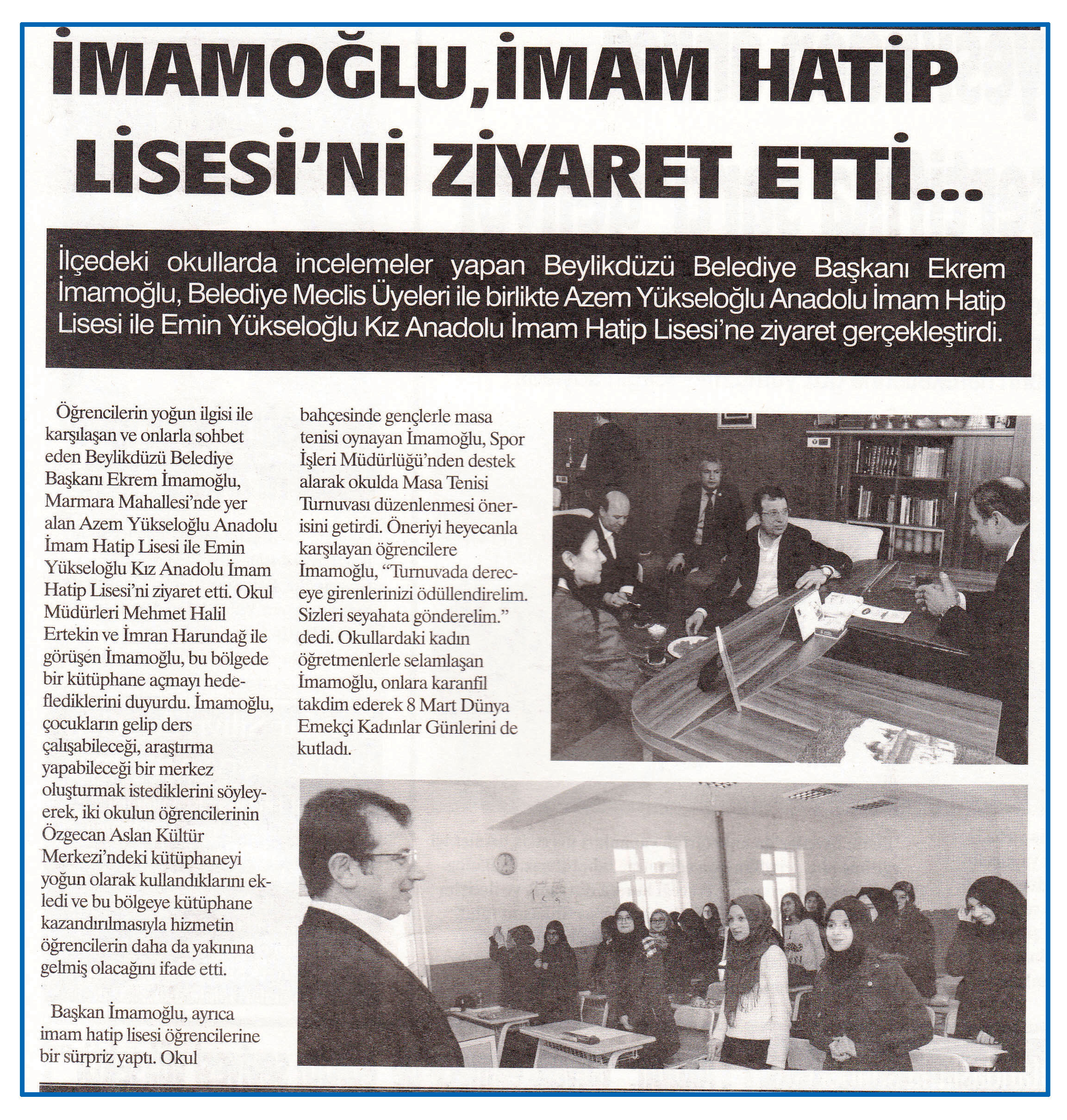 8 Mart 2017 tarihli "NABIZ" gazetesi. İlçedeki okullarda incelemeler yapan Beylikdüzü Belediye Başkanı Ekrem İmamoğlu, Belediye Meclis Üyeleri ile birlikte Azem Yükseloğlu Anadolu İmam Hatip Lisesi ile Emin Yükseloğlu Kız Anadolu İmam Hatip Lisesi'ne ziyaret gerçekleştirdi.