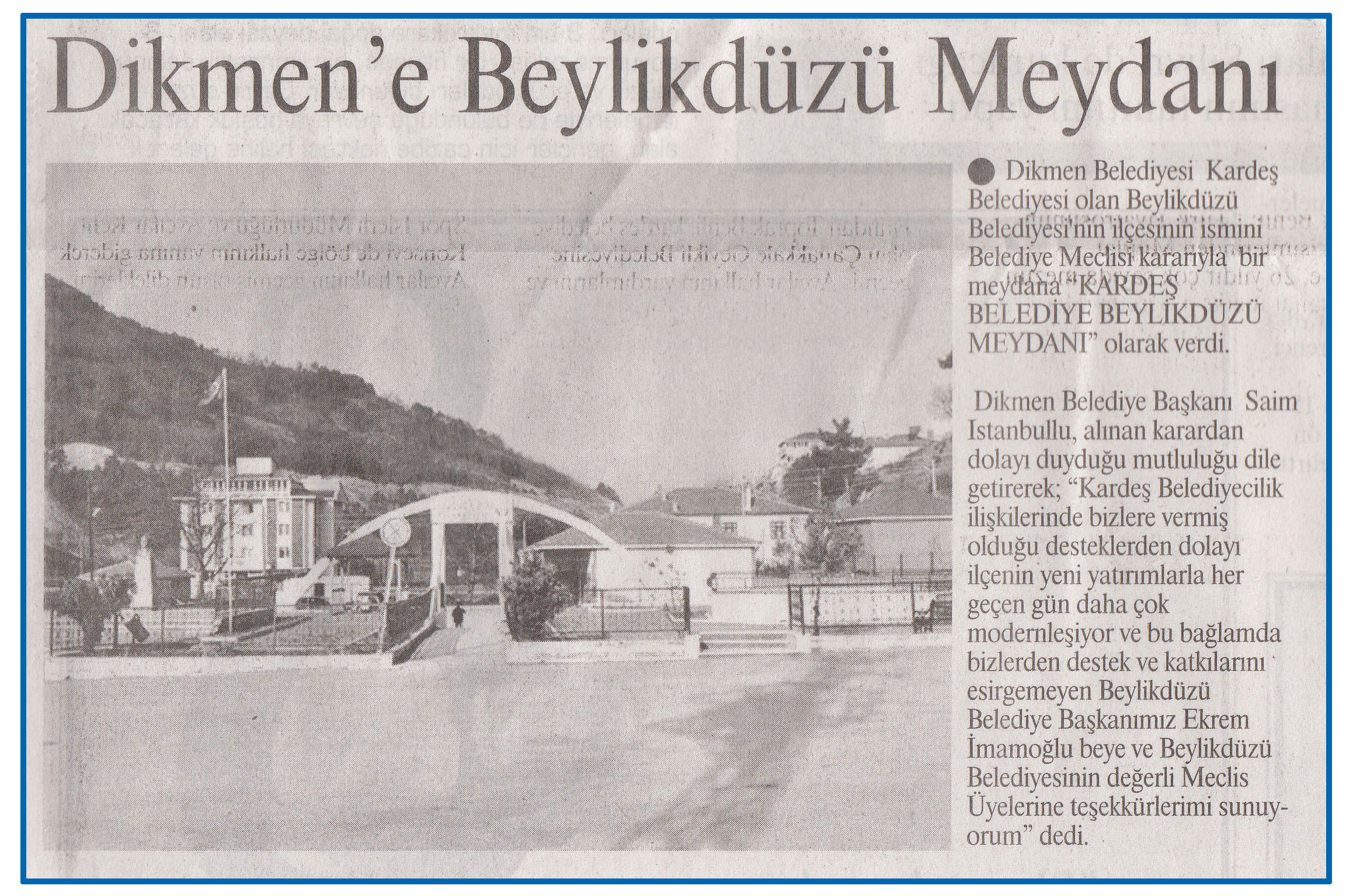 8 Mart 2017 Tarihli DURUM Gazetesi. Sinop'un Dikmen Belediyesi, kardeş belediye olan Beylikdüzü Belediyesi'nini ilçesinin ismini Belediye Meclisi kararıyla bir meydana "Kardeş Belediye Beylikdüzü Meydanı" olarak verdi.