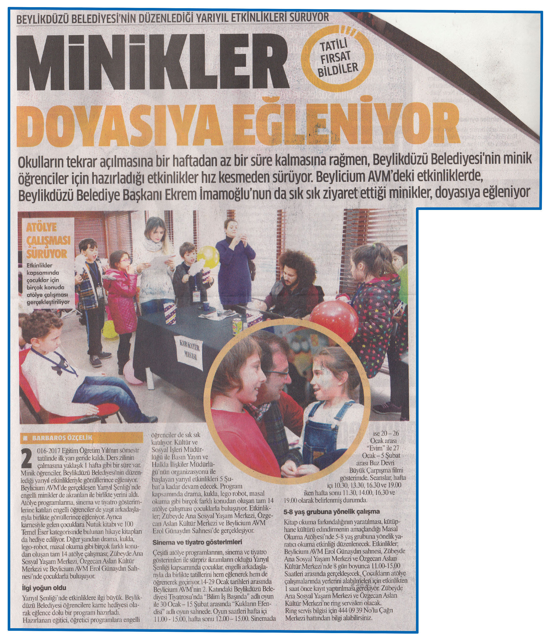 1 Şubat 2017 Tarihli "GAZETEM İSTANBUL" gazetesi. Okulların tekrar açılmasına bir haftadan az bir süre kalmasına rağmen, Beylikdüzü Belediyesi'nin minik öğrenciler için hazırladığı etkinlikler hız kesmeden sürüyor. Beylicium AVM'deki etkinliklerde, Beylikdüzü Belediye Başkanı Ekrem İmamoğlu'nun da sık sık ziyaret ettiği minikler, doyasıya eğleniyor.