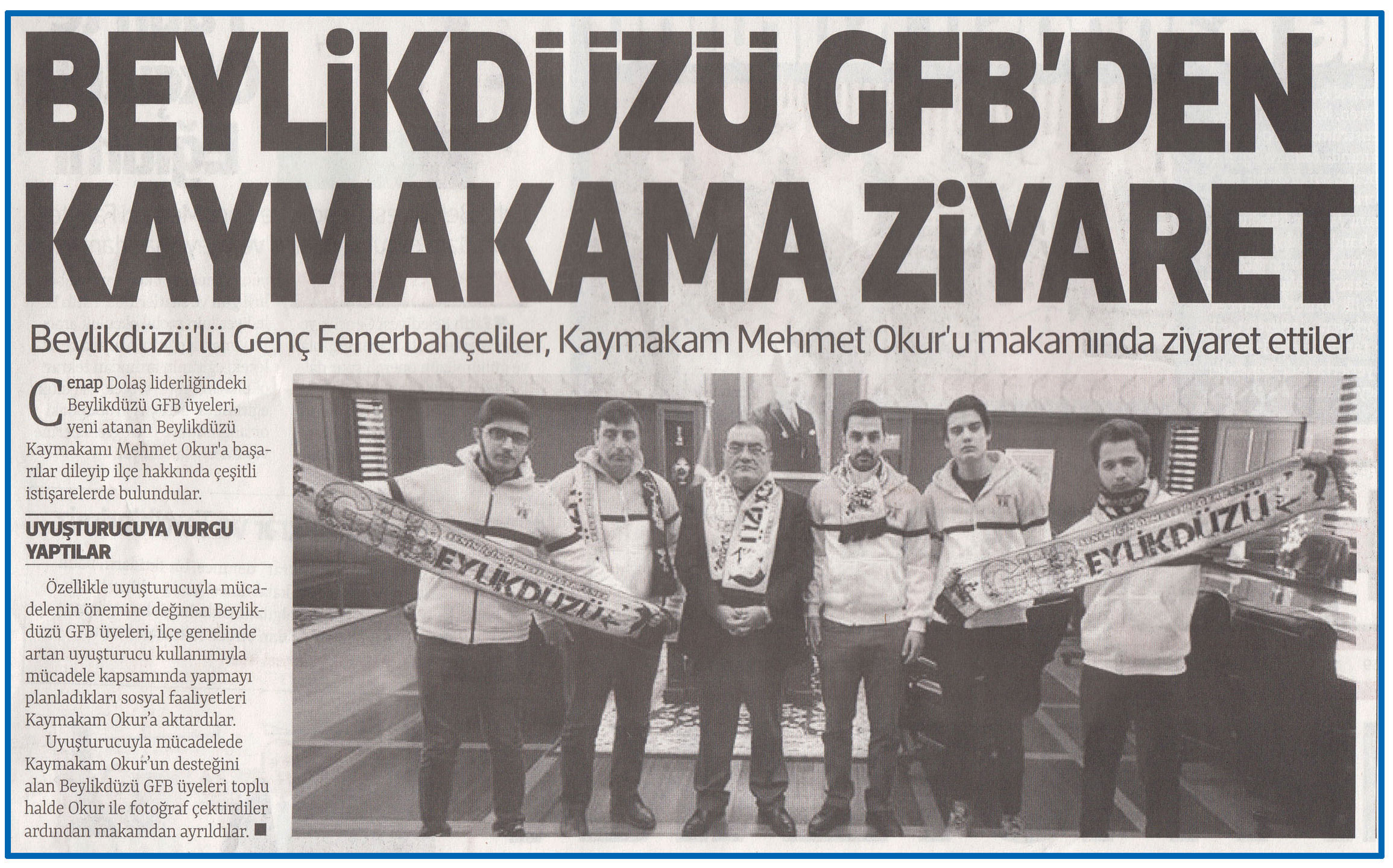 1 şubat 2017 tarihli "HABEREKSPRESS" gazetesi. Cenap Dolaş liderliğindeki Beylikdüzü GFB üyeleri, yeni atanan Beylikdüzü Kaymakamı Mehmet Okur'a başarılar dileyip ilçe hakkında çeşitli istişarelerde bulundular.