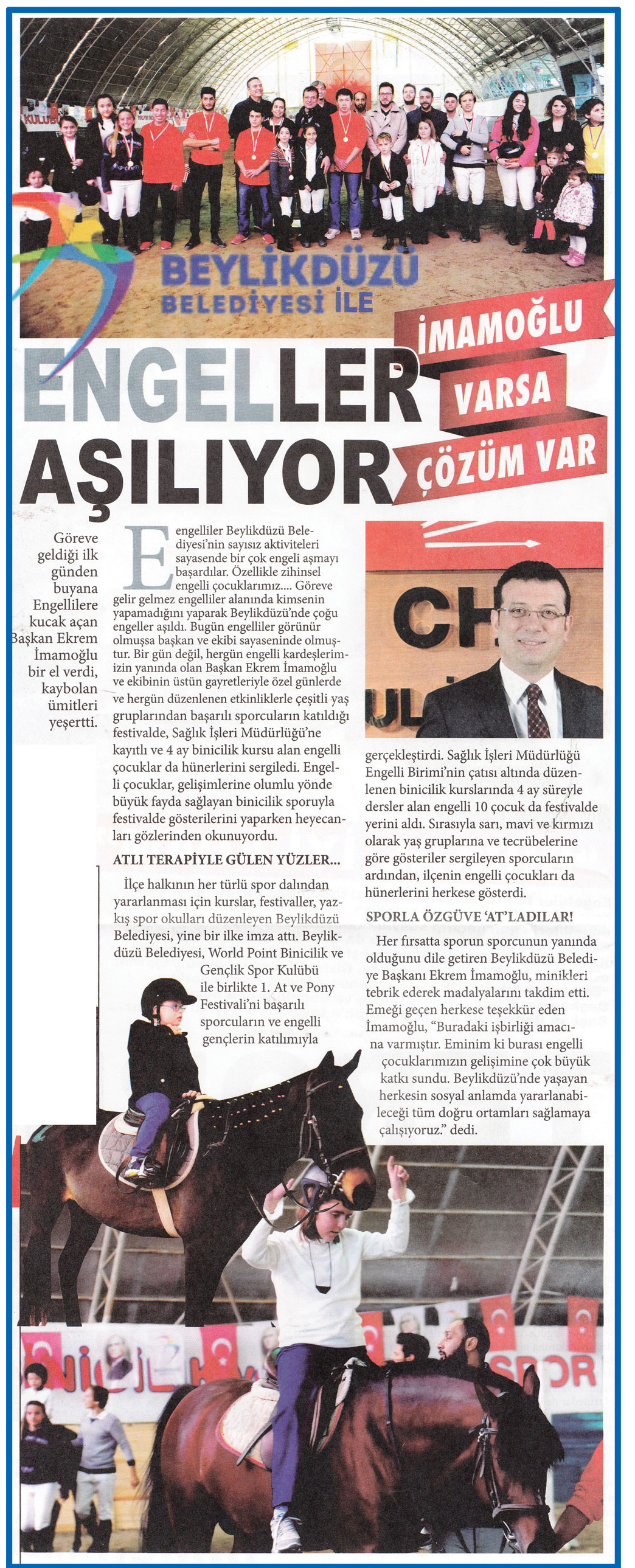 3 Ocak 2017 tarihli " Habersiz" gazetesi. Beylikdüzü Belediyesi, World Point Binicilik ve Gençlik Spor Kulübü ile birlikte 1. At ve Pony Festivali'ni başarılı spocuların ve engelli gençlerin katılımıyla gerçekleştirdi. Sağlık İşleri Müürlüğü Engelli Birimi'nin çatısı altında düzenlenen binicilik kurslarında 4 ay süre ile dersler alan 10 engelli çocukda festivalde hünerlerini sergiledi.