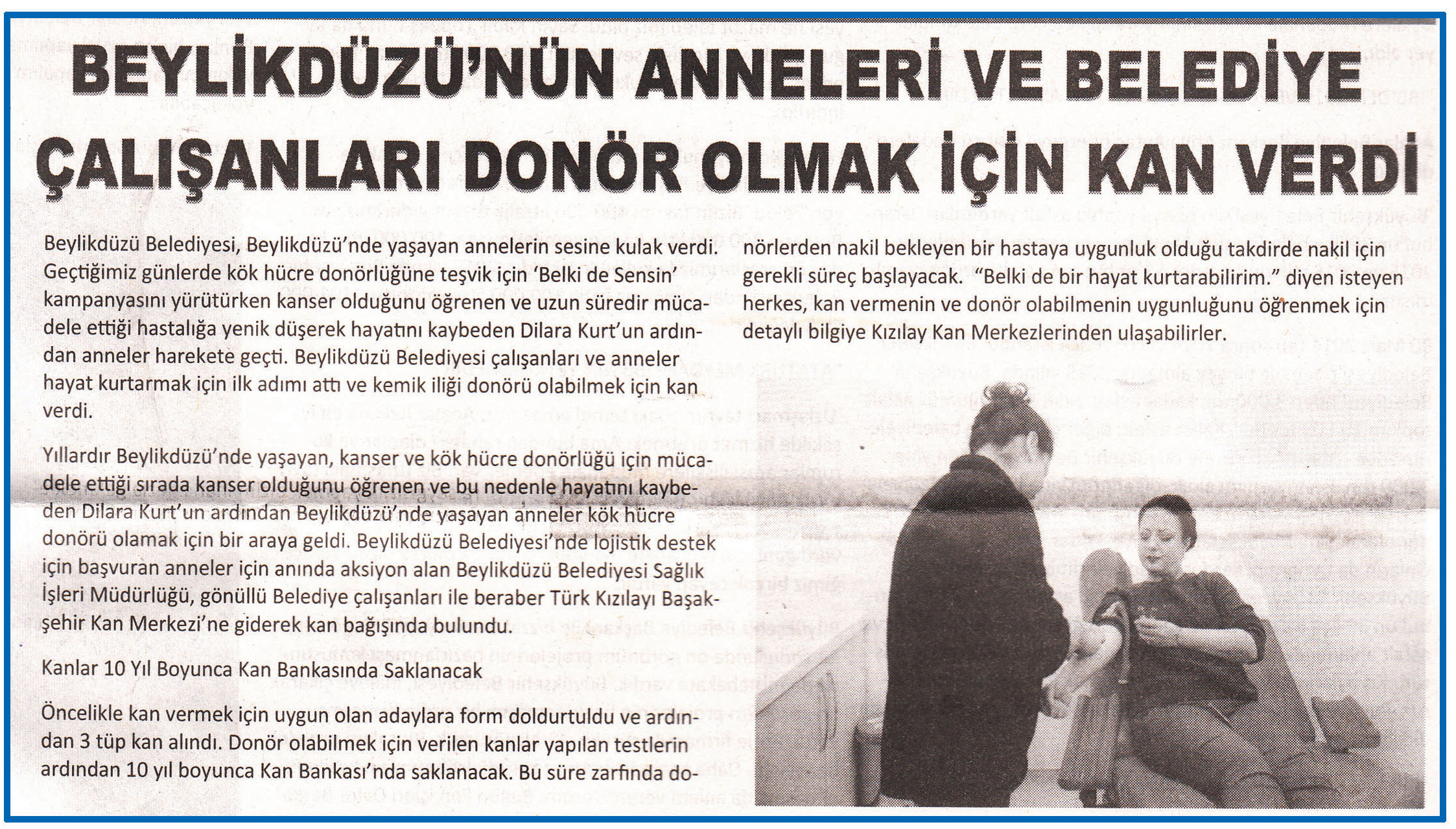4 Ocak 2017 tarihli "İSTANBUL GÜNDEMİ" haberi. Beylikdüzü Belediyesi, Beylikdüzü'nde yaşayan annelerin sesine kulak verdi. Yıllardır Beylikdüzü'nde yaşayan kanser ve kök hücre donörlüğü için mücadele ettiği sırada kanser olduğunu öğrenen ve bu nedenle hayatını kaybeden Dilara Kurt'un ardından Beylikdüzü'nde yaşayan anneler kök hücre donörü olmak için bir araya geldi. Beylikdüzü Belediyesi Sağlık İşleri Müdürlüğü, gönüllü belediye çalışanları ile beraber Türk Kızılay'ı Başakşehir Kan Merkezi'ne giderek kan bağışında bulundu.