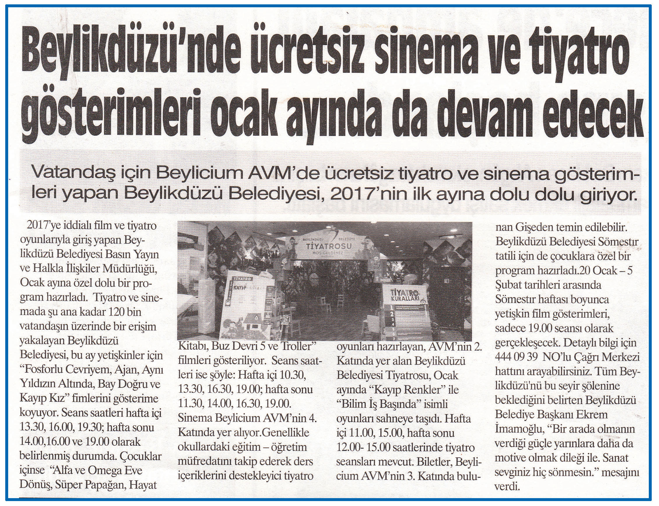 4 Ocak 2017 tarihli "MARMARA" gazetesi. 2017'de iddialı film ve tiyatro oyunlarıyla giriş yapan Beylidüzü Belediyesi Basın Yayın ve Halkla İlişkiler Müdürlüğü, ocak ayına özel program hazırladı. Beylidüzü Belediyesi bu ay yetişkinleri için, "Fosforlu Cevriyem, Ajan, Aynı Yıldızın Altında, Bay Doğru ve Kayıp Kız" filmlerine gösterime hazırlanırken, çocuklar içinse " Alfa ve Omega Eve Dönüş, Süper Papağan, Hayat Kitabı, Buz Devri 5 ve Troller" filmleri izleyicileri ile buluşacak.