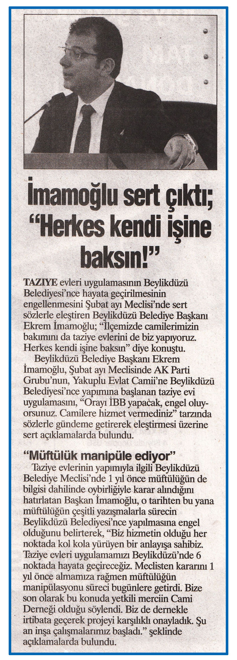 9 Şubat 2017 Tarihli KENTHABER Gazetesi. Taziye evleri uygulamasının Beylikdüzü Belediyesi'nce hayat geçirilmesinin engellenmesini Şubat ayı Meclisi'nde sert sözlerle eleştiren Beylikdüzü Belediye Başkanı Ekrem İmamoğlu; " İlçemizde camilerimizin bakımını da taziye evlerini de biz yapıyoruz. Herkes kendi işine baksın" diye konuştu
