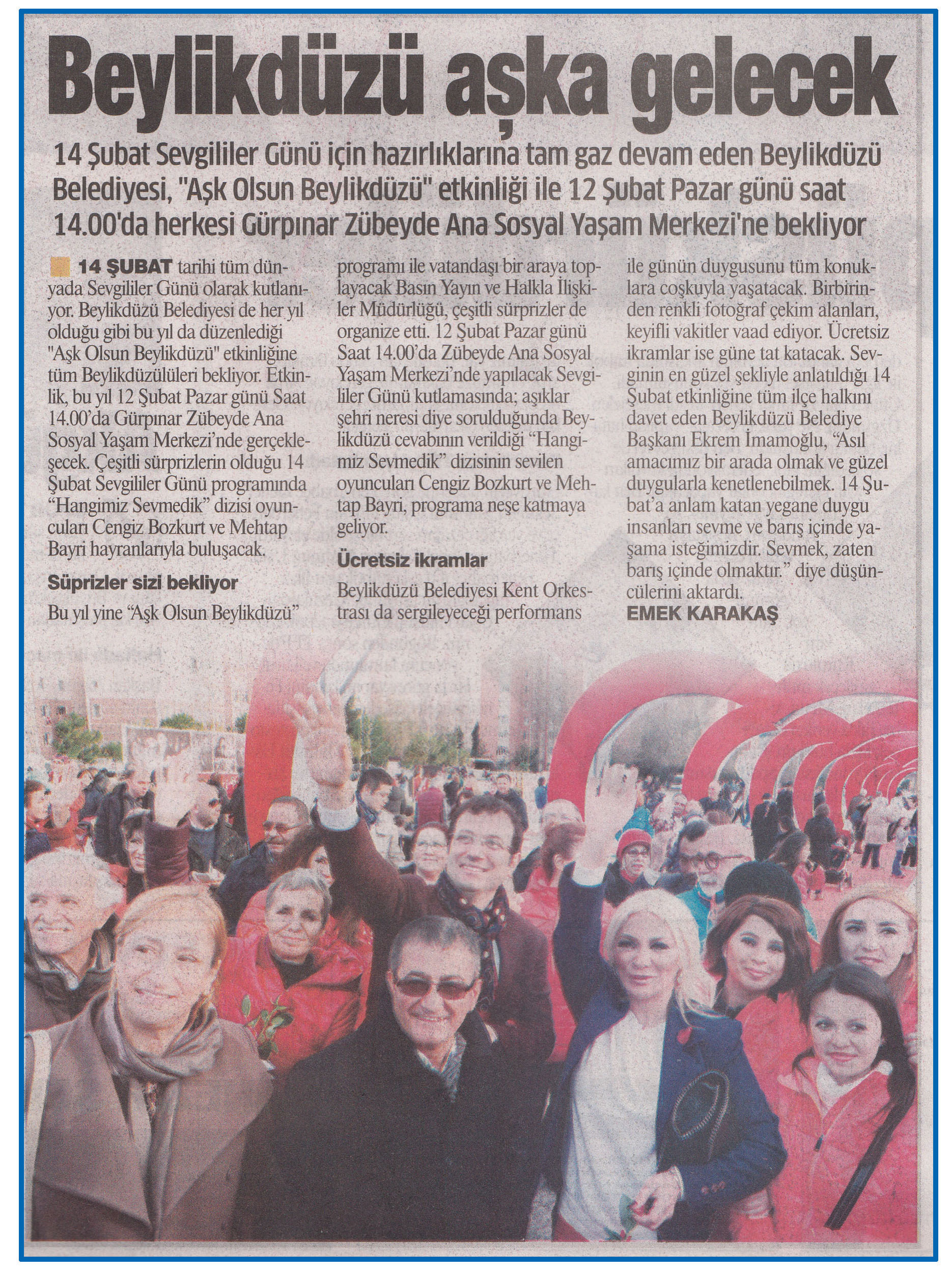 13 Şubat 2017 tarihli "GAZETEMİSTANBUL" gazetesi. 14 şubat Sevgililer Günü için hazırlıklarına tam gaz devam eden Beylikdüzü Belediyesi "Aşk Olsun Beylikdüzü" etkinliği ile 12 Şubat Pazar günü saat 14.00'da herkesi Gürpınar Zübeyde Ana Sosyal Yaşam Merkezi'ne bekliyor.