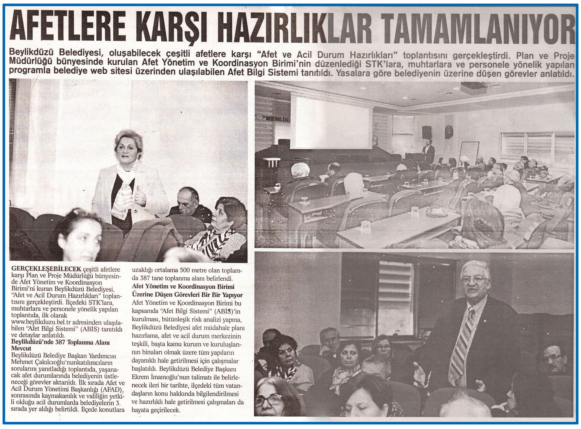 6 Ocak 2017 tarihli "MARMARA" gazetesi. Beylikdüzü Belediyesi gerçekleşebilecek çeşitli afetlere karşı Plan ve Proje Müdürlüğü bünyesinde Afet Yönetim ve Koordinasyon Birimi " Afet ve Acil Durum Hazırlıkları" toplantısını gerçekleştirdi. İlçedeki STK'lara, muhtarlara ve personele yönelik yapılan toplantıda ilk olarak www.beylikdüzü.bel.tr adresinden ulaşılabilen "Afet Bilgi Sisitemi" (ABİS) tanıtıldı ve detaylar anlatıldı.