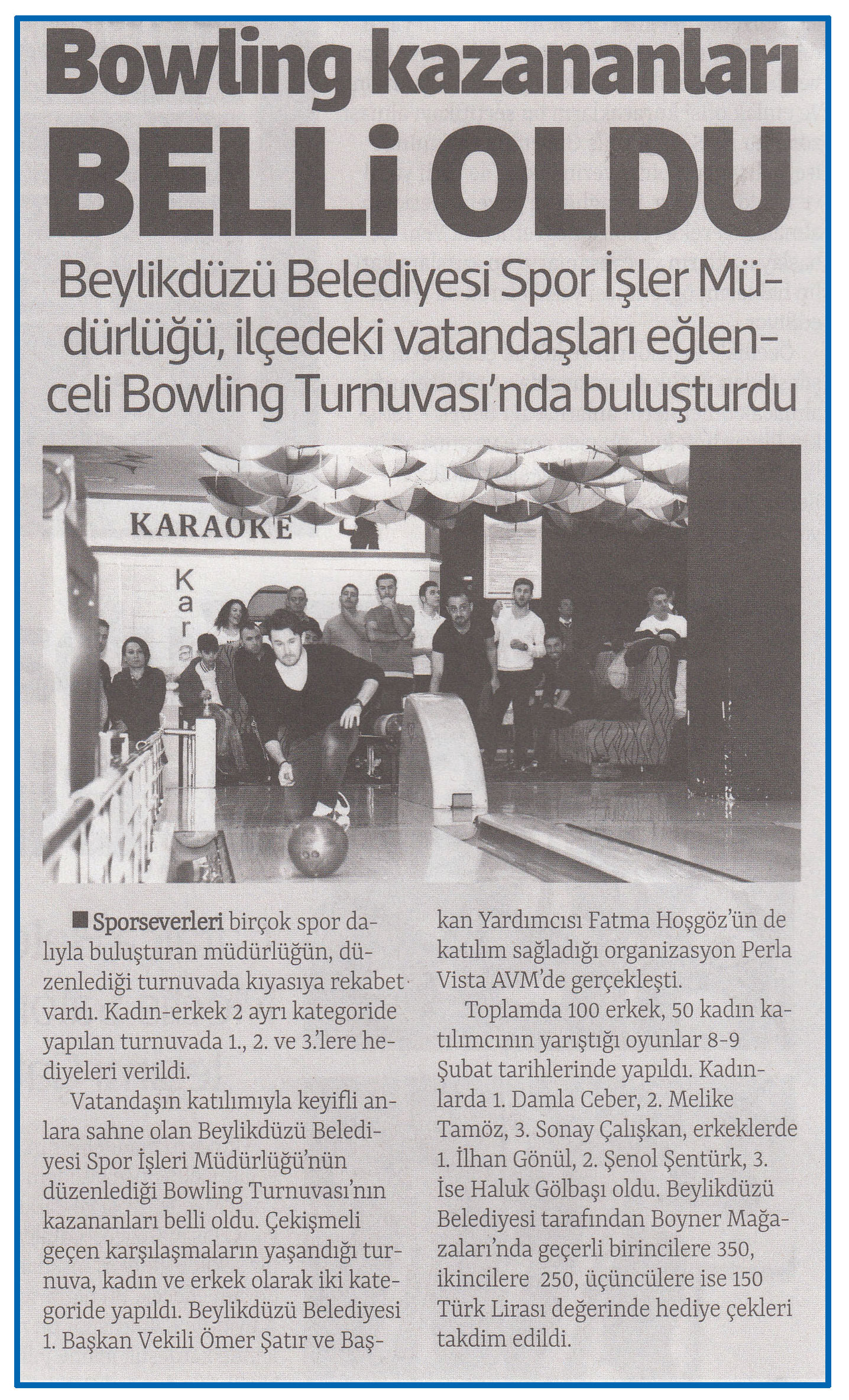 13 Şubat 2017 Tarihli 'METROPOL' Gazetesi. Beylikdüzü Belediyesi Spor İşler Müdürlüğü, ilçedeki vatandaşları eğlenceli Bowling Turnuvası'nda buluşturdu.