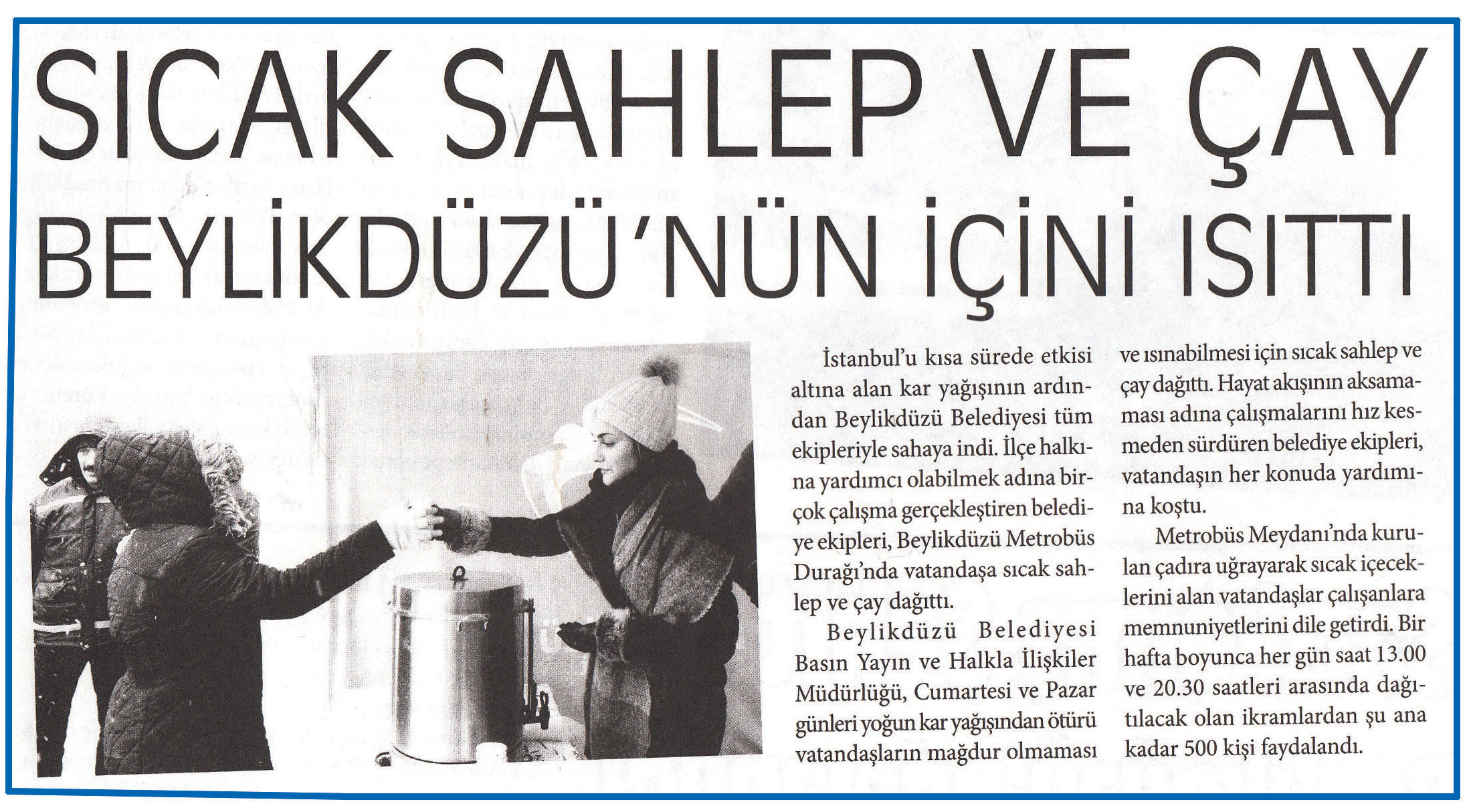 10 Ocak 2017 tarihli "HABERCİ" gazetesi. Beylikdüzü Belediyesi Basın Yayın ve Halkla İlişkiler Müdürlüğü, Cumartesi ve Pazar günleri yoğun kar yağışından ötürü vatandaşların mağdur olmaması ve ısınabilmesi için sıcak sahlep ve çay dağıttı.Metrobüs Meydanı'nda krulan çadıra uğrayarak sıcak içeceklerini alan vatandaşlar çalışanlara memnuniyetlerini dile getirdi.