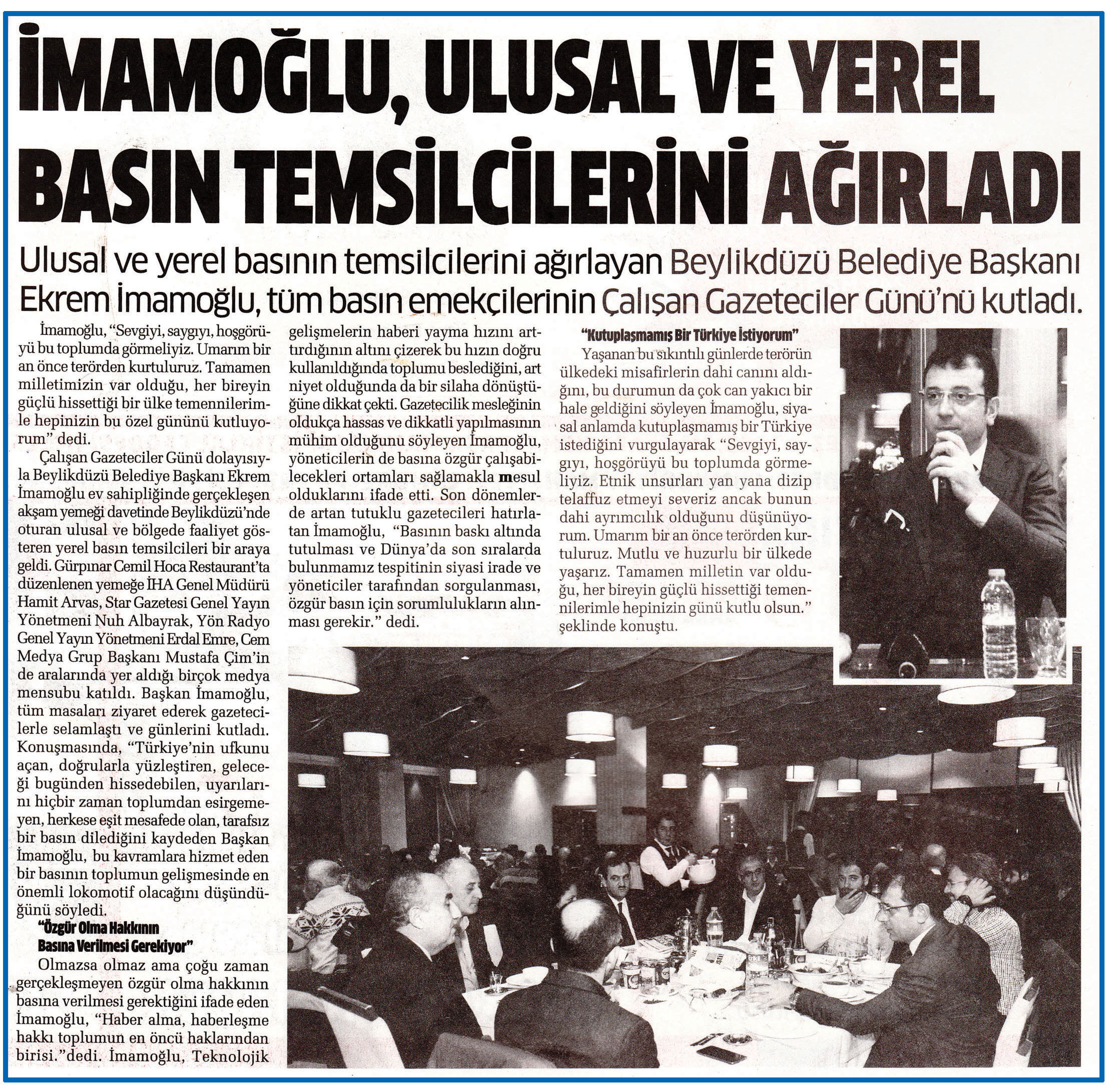 10 Ocak 2017 tarihli "TEKİN HABER" gazetesi. Ulusal ve yerel basının temsilcilerini ağırlayan Beylikdüzü Belediye Başkanı Ekrem İmamoğlu, tüm basın emekçilerinin Çalışan Gazeteciler Günü'nü kutladı