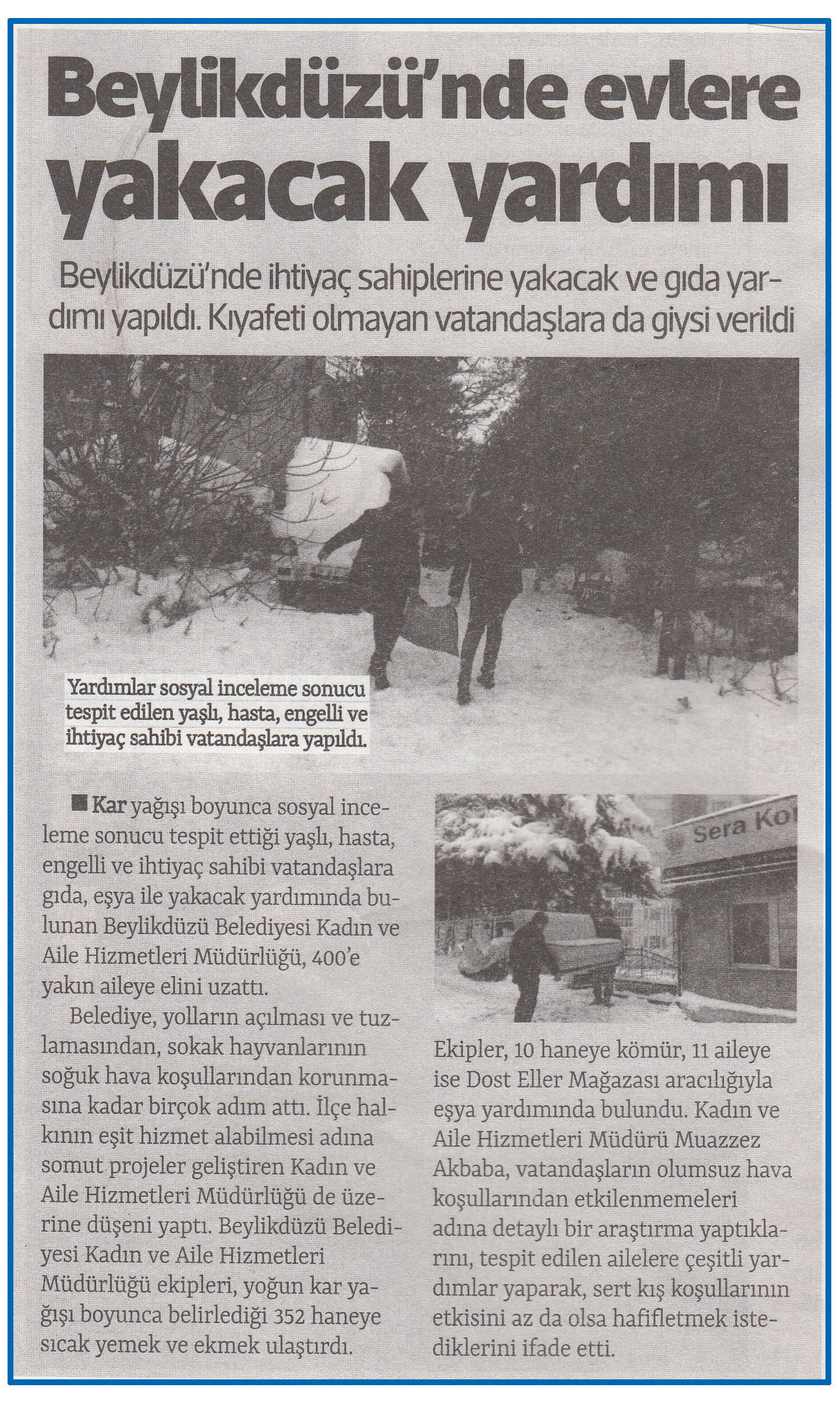 13 Ocak 2017 tarihli "HABER EKSPRESS" gazetesi. Kar yağışı boyunca sosyal inceleme sonucu tespit ettiği yaşlı, hasta, engelli ve ihtiyaç sahibi vatandaşlara gıda, eşya ile yakacak yardımında bulunan Beylikdüzü Belediyesi Kadın ve Aile Hizmetleri Müdürlüğü 400' yakın aileye elini uzattı.