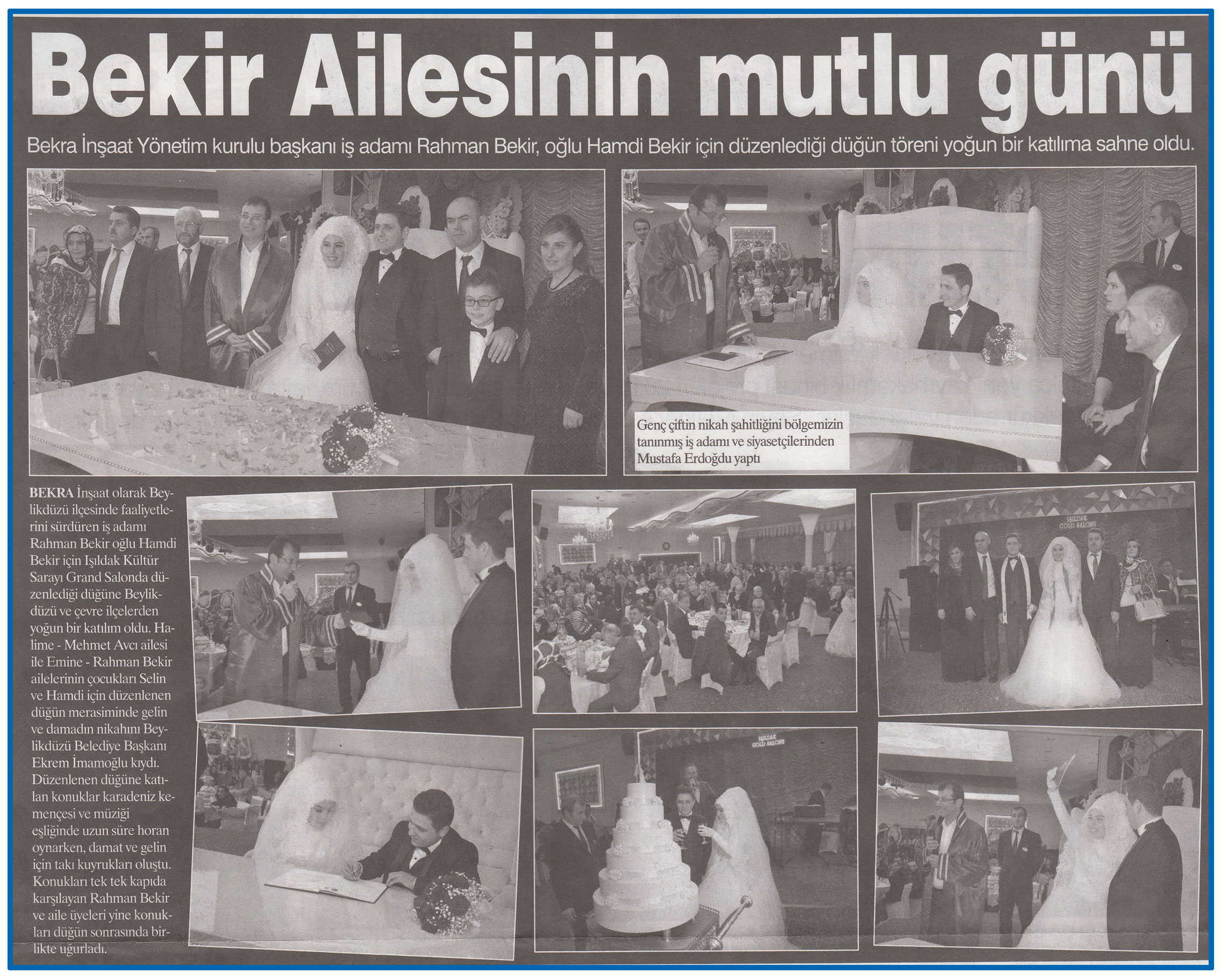 4 Ocak 2016 tarihli "ADİL HABER" gazetesi. Bekra İnşaat olarak Beylikdüzü ilçesinde faaliyetleri sürdüren iş adamı Rahman Bekir oğlu Hamdi Bekir için Işıldak Kültür Sarayı Grand Salonda düzenlediği düğüne Beylikdüzü ve çevre ilçelerden yoğun bir katılım oldu. Halime - Mehmet Avcı ailesi ile Emine - Rahman Bekir ailelerinin çocukları Selin ve Hamdi için düzenlenen düğün merasiminde gelin ve damadın nikahını Beylikdüzü Belediye Başkanı Ekrem İmamoğlu kıydı.