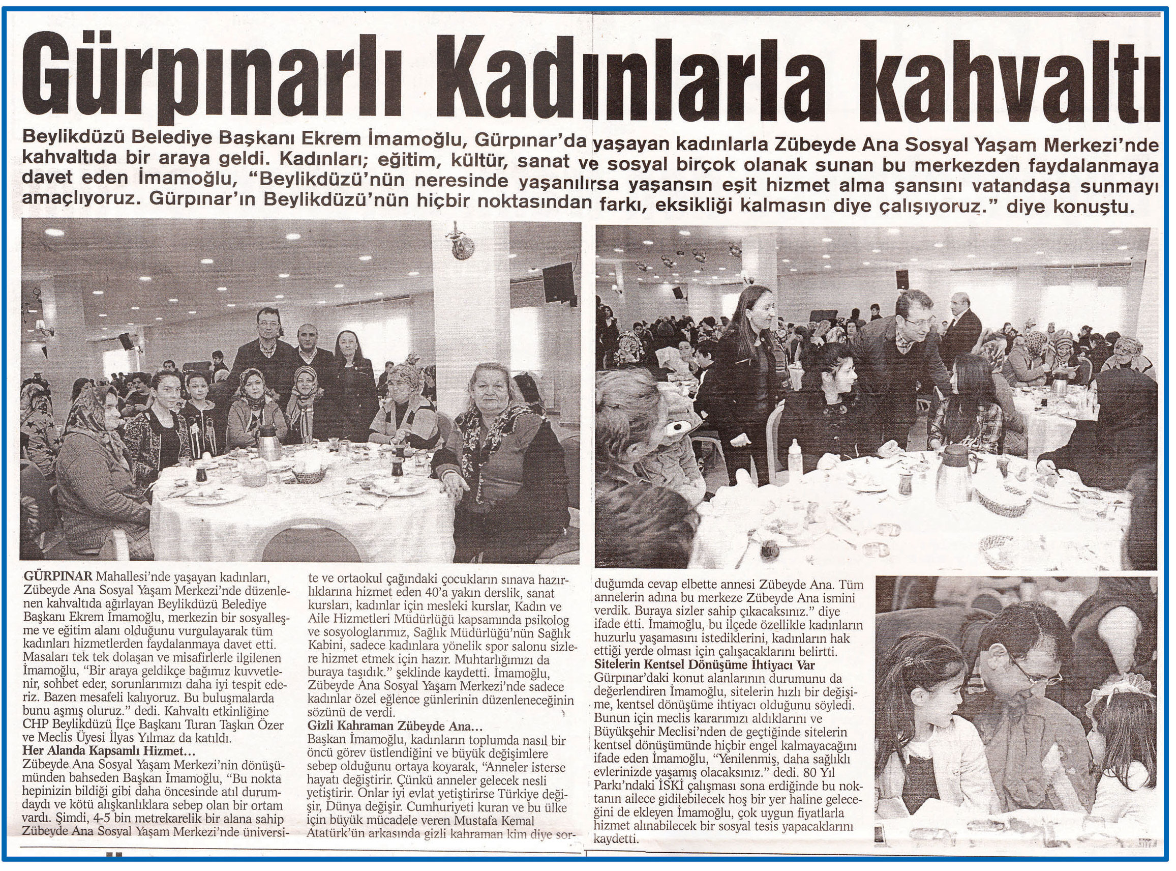 24 Ocak 2017 tarihli"MARMARA" gazetesi. Beylikdüzü Belediye Başkanı Ekrem İmamoğlu, Gürpınar'da yaşayan kadınlarla Zübeyde Ana Sosyal Yaşam Merkezi'nde kahvaltıda bir araya geldi. İmamoğlu, merkezin bir sosyalleşme ve eğitim alanı olduğunu vurgulayarak tüm kadınları hizmetlerden faydalanmaya davet etti.