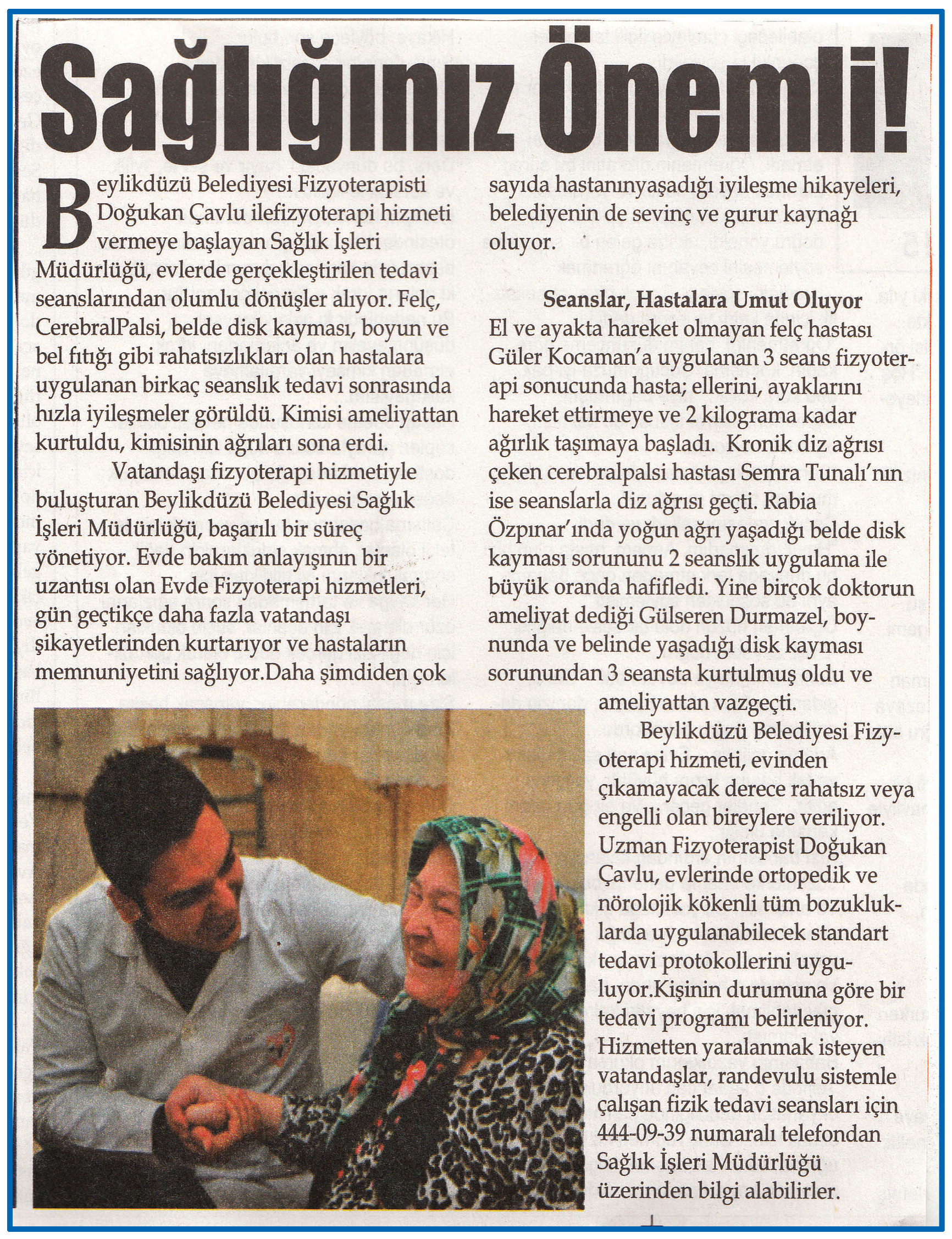 4 Ocak 2016 tarihli "BEYLİKDÜZÜ" gazetesi. Beylikdüzü Belediyesi Fizyoterapisti Doğukan Çavlu ile fizyoterapi hizmeti vermeye başlayan Sağlık İşleri Müdürlüğü, evlerde gerçekleştirilen tedavi seanslarından olumlu dönüşler alıyor.