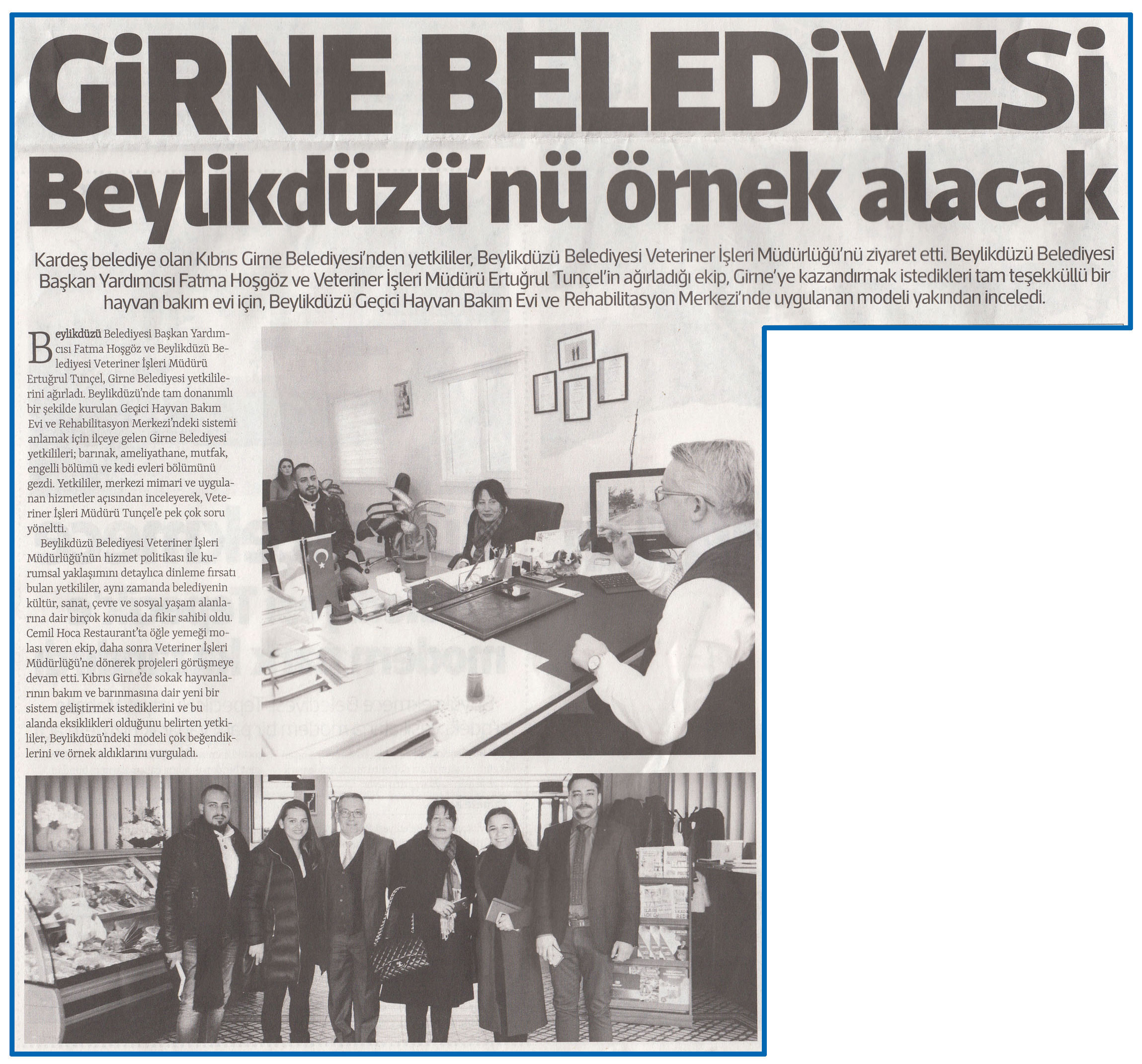 27 Ocak 2017 tarihli "METROPOL" gazetesi. Kardeş belediye olan Kıbrıs Girne Belediyesi'den yetkililer, Beylikdüzü Belediyesi Veteriner İşler Müdürlüğü'nü ziyaret etti. Beylikdüzü'nde tam donanımlı bir şekilde kurulan Geçici Hayvan Bakım Evi ve Rehabilitasyon Merkezi'ndeki sistemi anlamak ve bir benzerini , Girne'ye kazandırmak için için Beylikdüzü'ne gelen yetkililer; barınak, ameliyathane, mutfak, engelli bölümü ve kedi bölümünü gezdi, uygulanan modeli yakından inceledi.