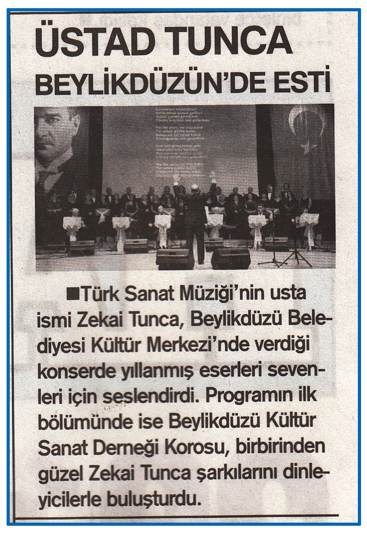 4 Ocak 2016 tarihli "HABERCİ" gazetesi. Türk Sanat Müziği'nin usta ismi Zekai Tunca, Beylikdüzü Belediyesi Kütür Merkezi'nde erdiği konserde yıllanmış eserleri sevenleri için seslendirdi.