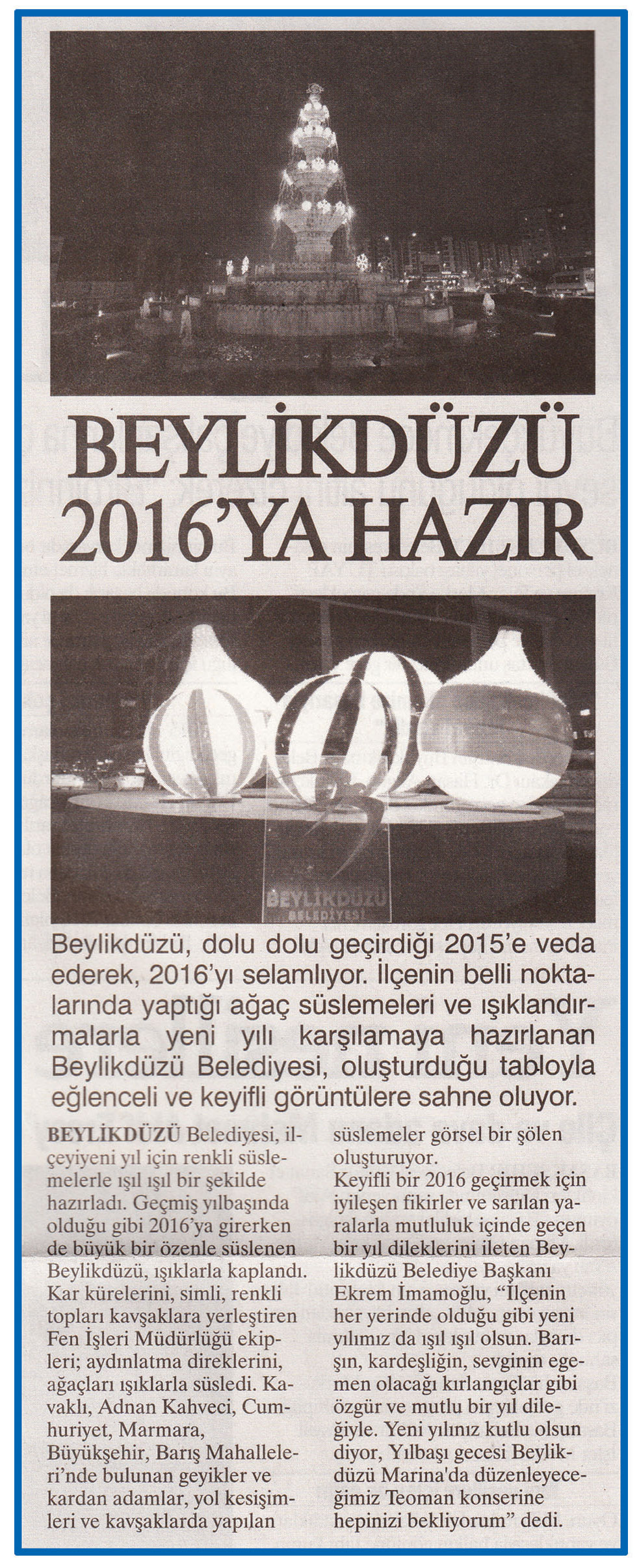 4 Ocak 2016 tarihli "MANŞET" gazetesi. Beylikdüzü, dolu dolu geçirdiği 2015'e veda ederek, 2016'yı selamlıyor. İlçenin belli noktalarında yaptığı ağaç süslemeleri ve ışıklandırmalarla yeni yılı karşılamaya hazırlanan Beylikdüzü Belediyesi, oluşturduğu tabloyla eğlenceli ve keyifli görüntülere sahne oluyor.