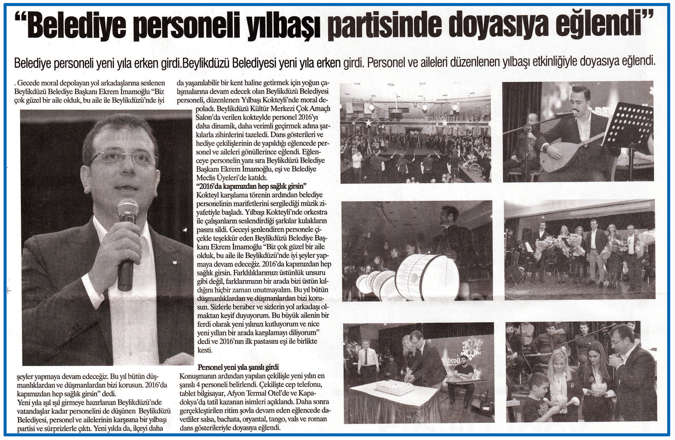 4 Ocak 2016 tarihli "MEDYA" gazetesi. Belediye personeli yeni yıla erken girdi. Beylikdüzü Belediyesi yeni yıla erken girdi. Personel ve aileleri düzenlenen yılbaşı etkinliğiyle doyasıya eğlendi.