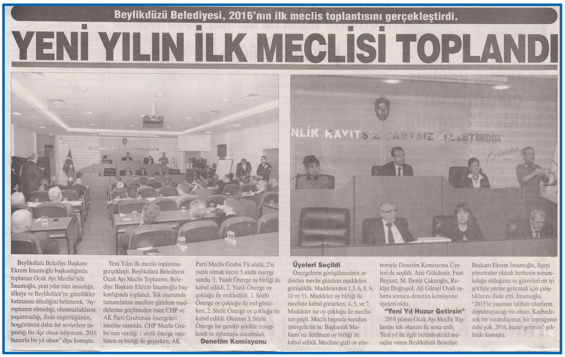 5 Ocak 2016 tarihli "BÜYÜKÇEKMECE" gazetesi. Beylikdüü Belediye Başkanı Ekrem İmamoğlu başkanlığında toplanan Ocak Ayı Meclisi'nde İmamoğlu, yeni yılın tüm insanlığa, ülkeye ve Beylikdüzü'ne güzellikler katmasını dilediğini belirterek, "Ayrışmanın olmadığı, olumsuzlukların yaşanmadığı, ifade özgürlüğünün, hoşgörünün daha üst seviyelere taşındığı bir ilçe olsun istiyorum. 2016 huzurlu bir yıl olsun" diye konuştu.
