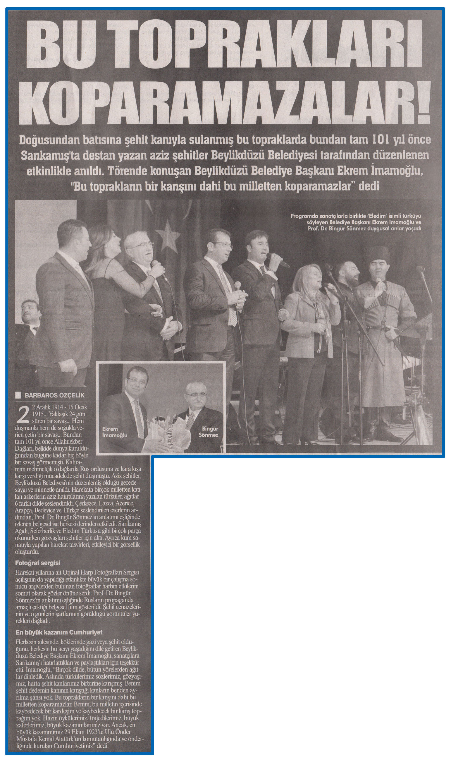 7 Ocak 2016 tarihli "GAZETE İSTANBUL" gazetesi. Doğusundan batısına şehit kanıyla sulanmış bu topraklarda bundan tam 101 yıl önce Sarıkamış'ta destan yazan aziz şehitler Beylikdüzü Belediyesi tarafından düzenlenen etkinlikle anıldı. Törende konuşan Beylikdüzü Belediye Başkanı Ekrem İmamoğlu, "Bu toprakların bir karışını dahi bu milletten koparamazlar" dedi.