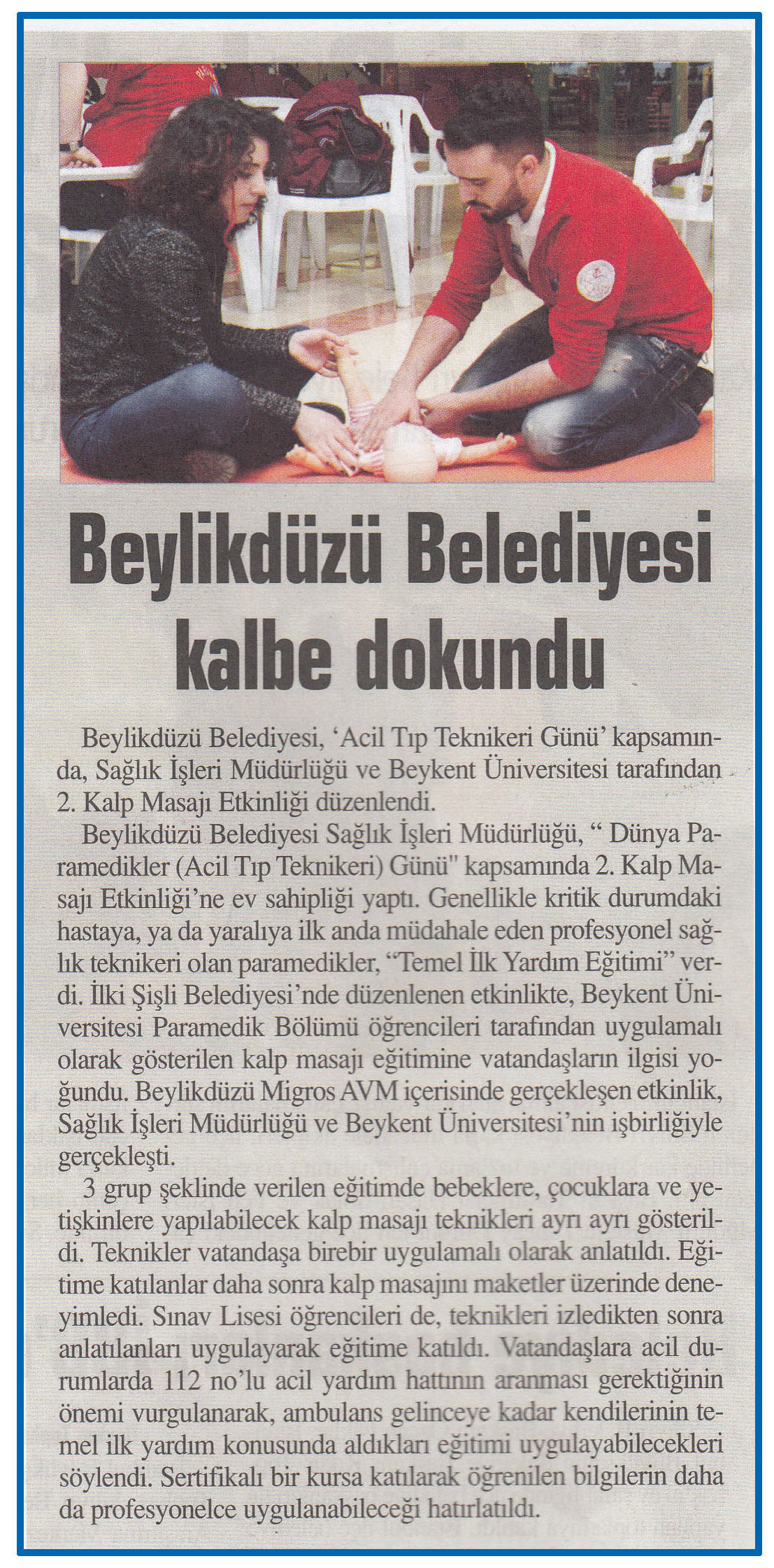 8 Ocak 2016 tarihli "BİZİMYAŞAM" gazetesi. Beylikdüzü Belediyesi, "Acil Tıp Teknikeri Günü" kapsamında, Sağlık İşleri Müdürlüğü ve Beykent Üniversitesi tarafından 2. Kalp Masajı Etkinliği düzenlendi.