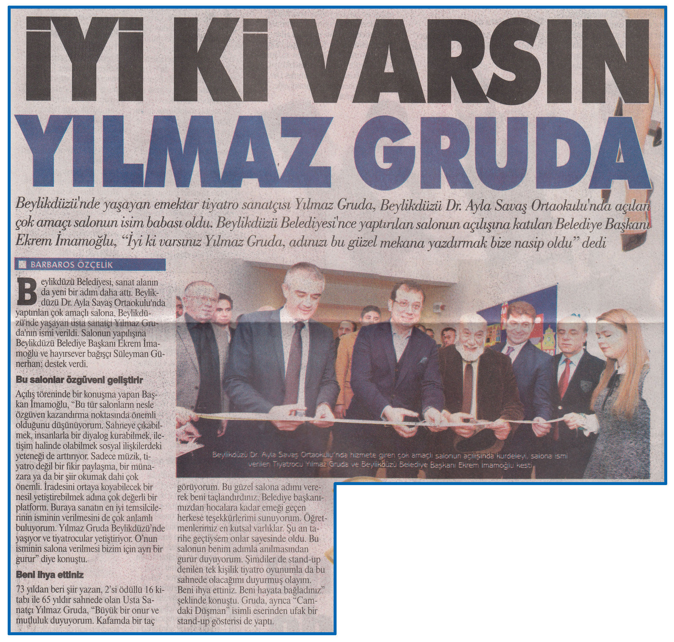 8 Ocak 2016 tarihli "GAZETE İSTANBUL" gazetesi. Beylikdüzü'nde yaşayan emektar tiyatro sanatçısı Yılmaz Gruda, Beylikdüzü Dr. Ayla Savaş Ortaokulu'nda açılan çok amaçlı salonun isim babası oldu.