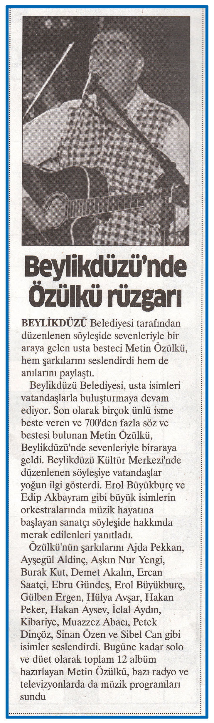 8 Ocak 2016 tarihli "HABER EKSPRESS" gazetesi. Beylikdüzü Belediyesi tarafından düzenlenen söyleşide seveneriyle bir araya gelen usta besteci Metin Özülkü, hem şarkılarını seslendirdi hemde anılarını paylaştı.