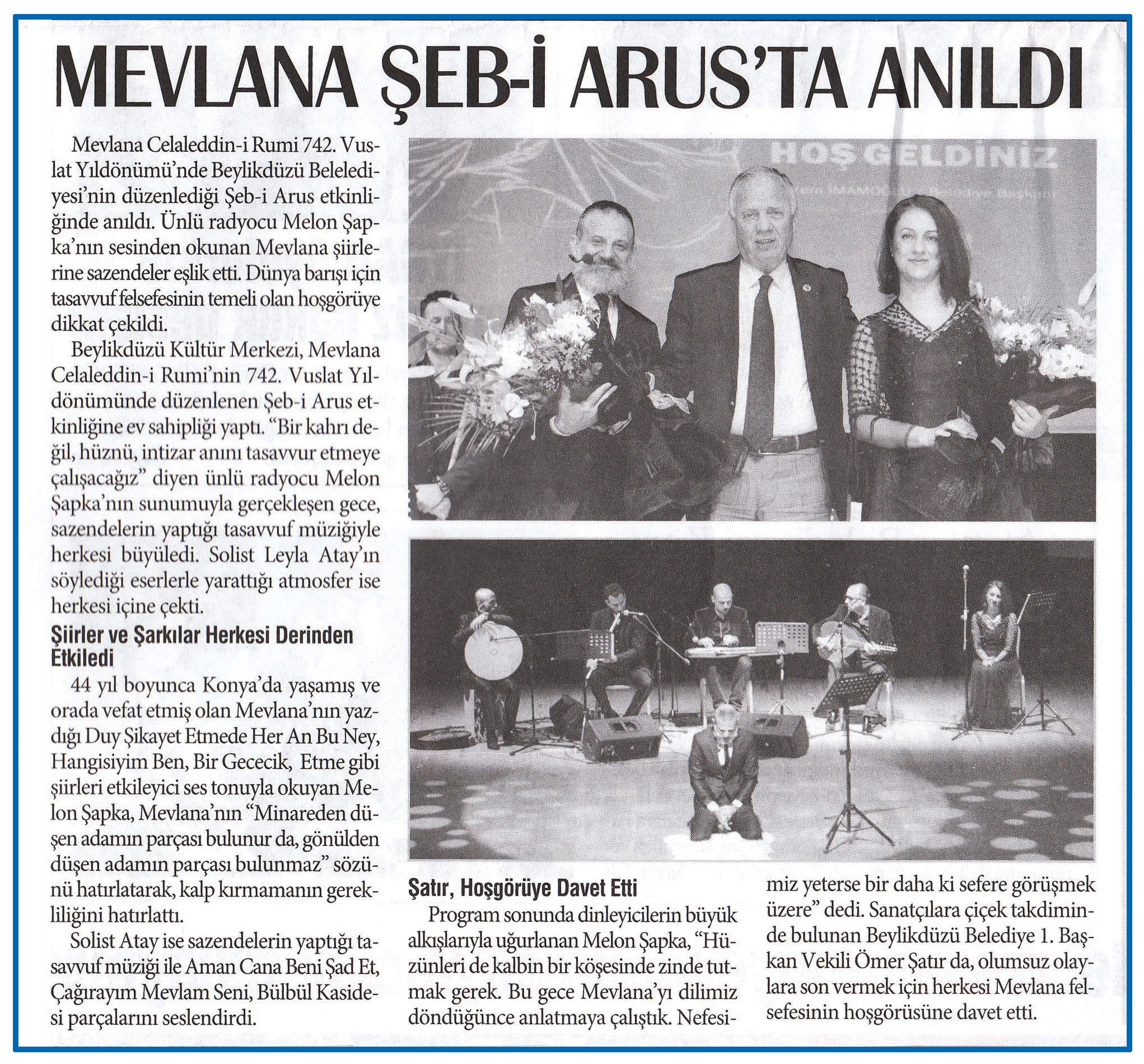 8 Ocak 2016 tarihli "YEREL MEDYA" gazetesi. Mevlana Celaleddin-i Rumi 742. Vuslat Yıldönümü'nde Beylikdüzü Belediyesi'nin düzenlediği Şeb-i Arus etkinliğinde anıldı. Ünlü radyocu Melon Şapka'nın sesinden okunan Mevlana şiirlerine sazendeler eşlik etti. Dünya barışı için tasavvuf felsefesinin temeli olan hoşgörüye dikkat çekildi.