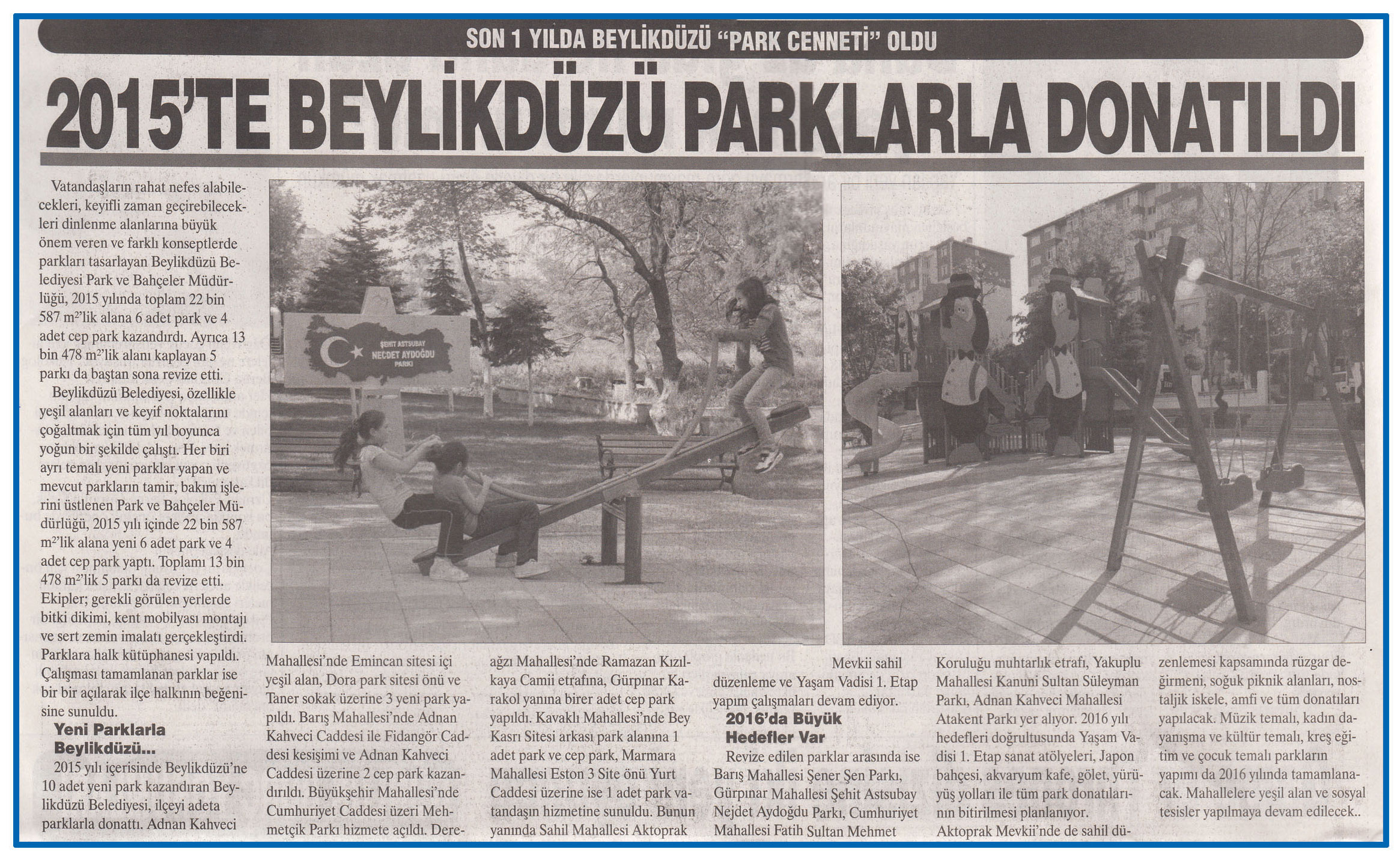11 Ocak 2016 tarihli "BÜYÜKÇEKMECE" gazetesi. Vatandaşların rahat nefes alabilecekleri, keyifli zaman geçirebilecekleri dinlenme alanlarına büyük önem veren ve farklı konseptlerde parkları tasarlayan Beylikdüzü Belediyesi Park ve Bahçeler Müdürlüğü, 2015 yılında toplam 22 bin 587 m²'lik alana 6 adet park ve 4 adet cep park kazandırdı.