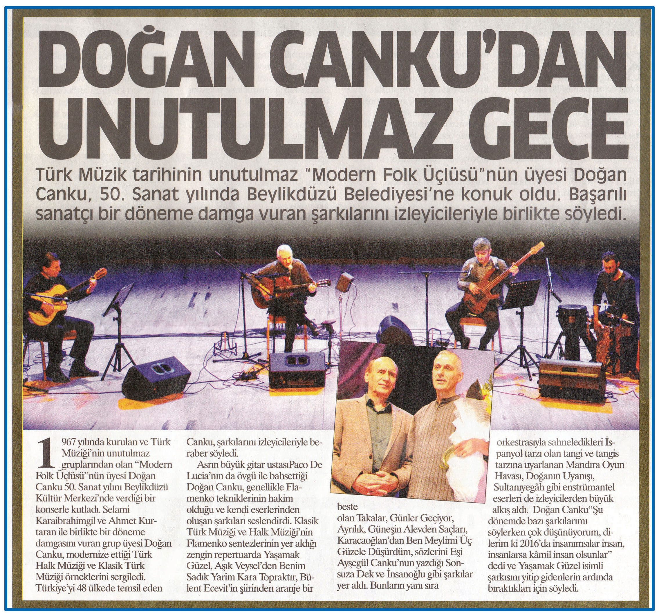 12 Ocak 2016 tarihli "HABER EKSPRESS" gazetesi.Türk Müzik tarihinin unutulmaz "Modern Folk Üçlüsü"nün üyesi Doğan Canku, 5. Sanat yılında Beylikdüzü Belediyei'ne konuk oldu. Başarılı sanatçı bir döneme damga vuran şarkılarını izleyicileriyle söyledi.