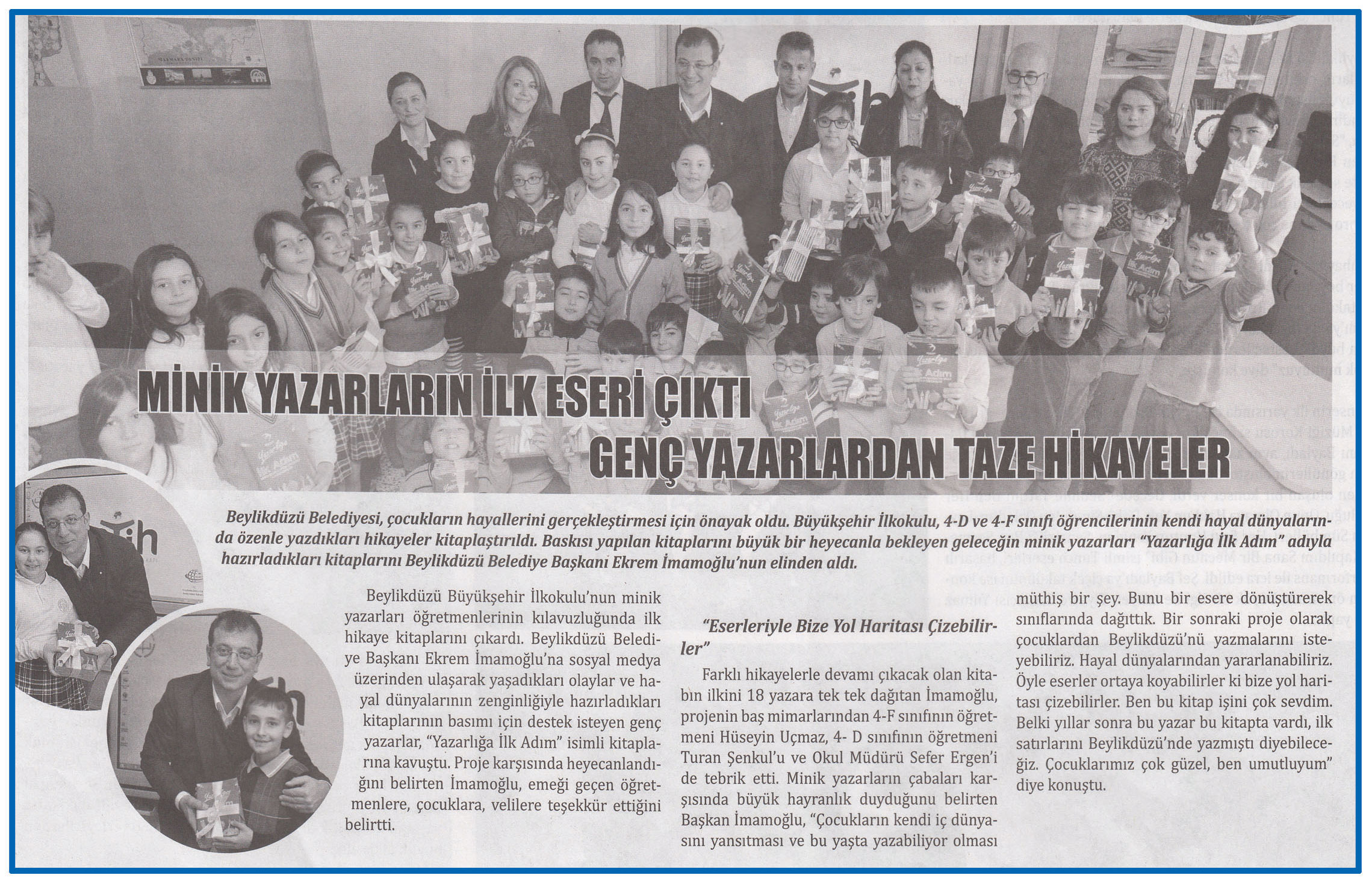 13 Ocak 2016 tarihli "AYNA" gazetesi. Beylikdüzü Büyükşehir İlkokulu'nun minik yazarları öğretmenlerinin kılavuzluğunda ilk hikaye kitaplarını çıkardı. Beylikdüzü Belediye Başkanı Ekrem İmamoğlu'na sosyal medya üzeriden ulaşarak yaşadıkları olaylar ve hayal dünyalarının zenginliğiyle hazırladıkları kitaplarının basımı için destek isteyen genç yazarlar, "Yazarlığa İlk Adım" isimli kitaplarına kavuştu.