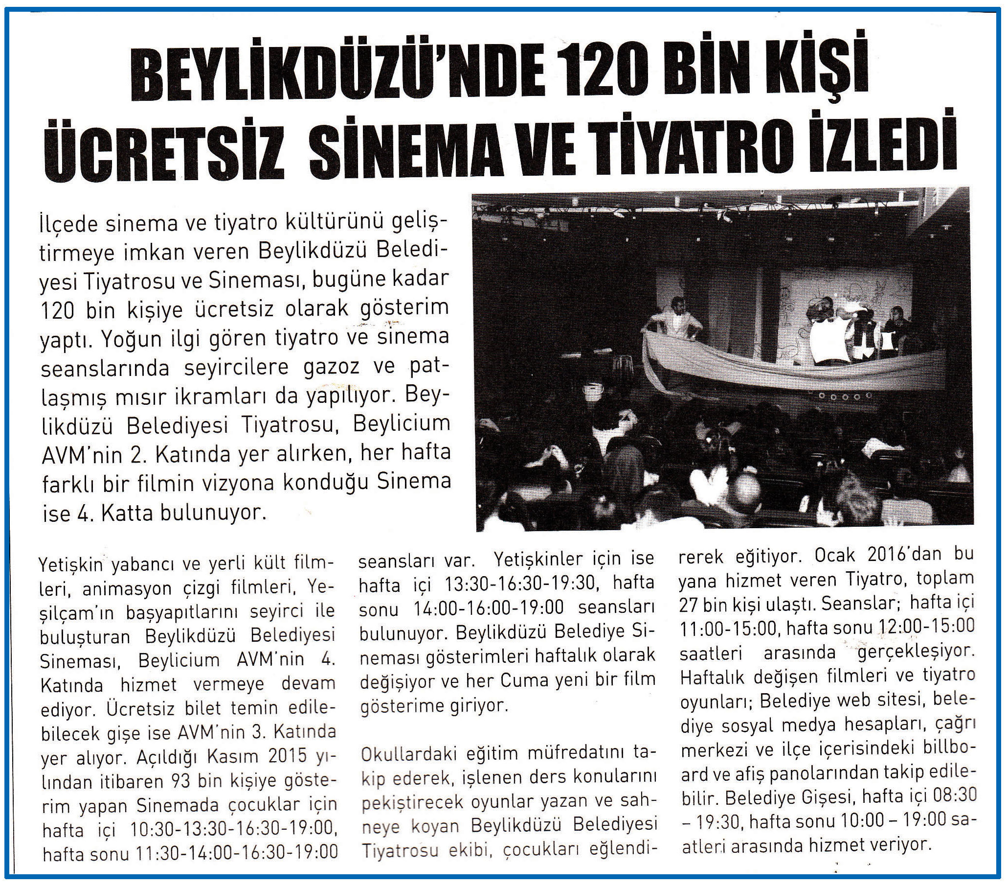 13 Ocak 2016 tarihli "HABERVERİYORUM" gazetesi. İlçede sinema ve tiyatro kültürünü geliştirmeye imkan veren Beylikdüzü Belediyesi Tiyatrosu ve Sineması, bugüne kadar 120 bin kişiye ücretsiz olarak gösterim yaptı.