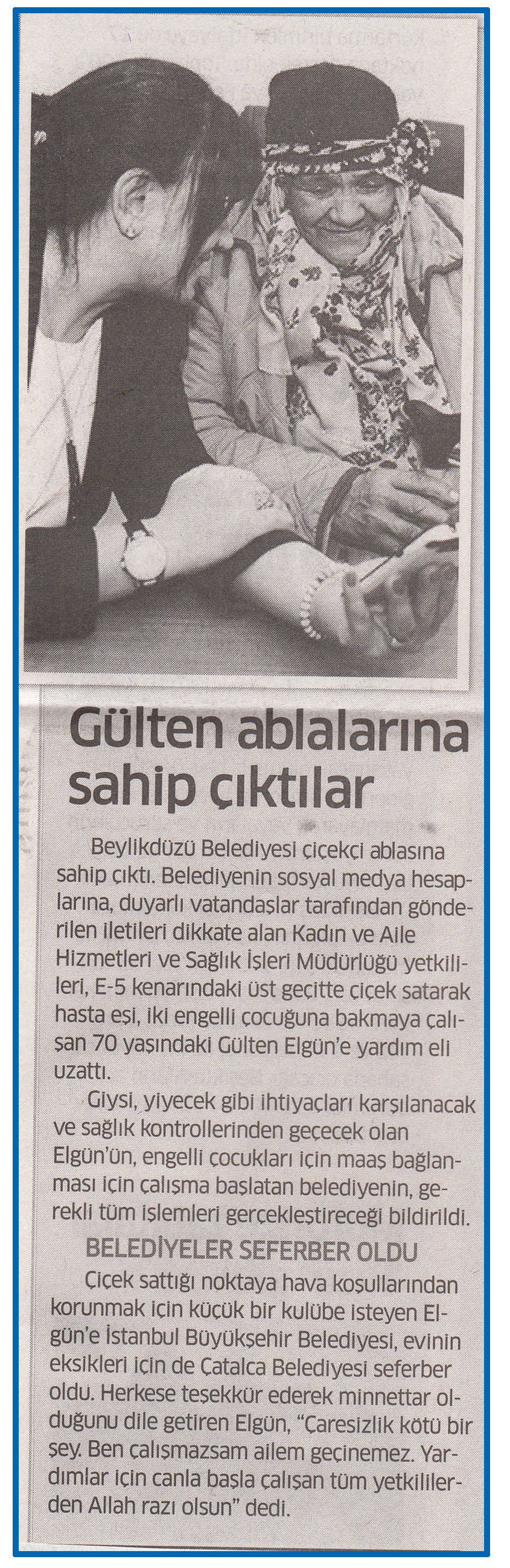 13 Ocak 2016 tarihli "KENT YAŞAM"Belediyenin sosyal medya hesaplarına, duyarlı vatandaşlar tarafından gönderilen iletileri dikkate alan Kadın ve Aile Hizmetleri ve Sağlık İşleri Müdürlüğü yetkilileri, E-5 kenarındaki üst geçitte çiçek satarak hasta eşi, iki engelli çocuğuna bakmaya çalışan 70 yaşındaki Gülten Elgün'e yardım eli uzattı.