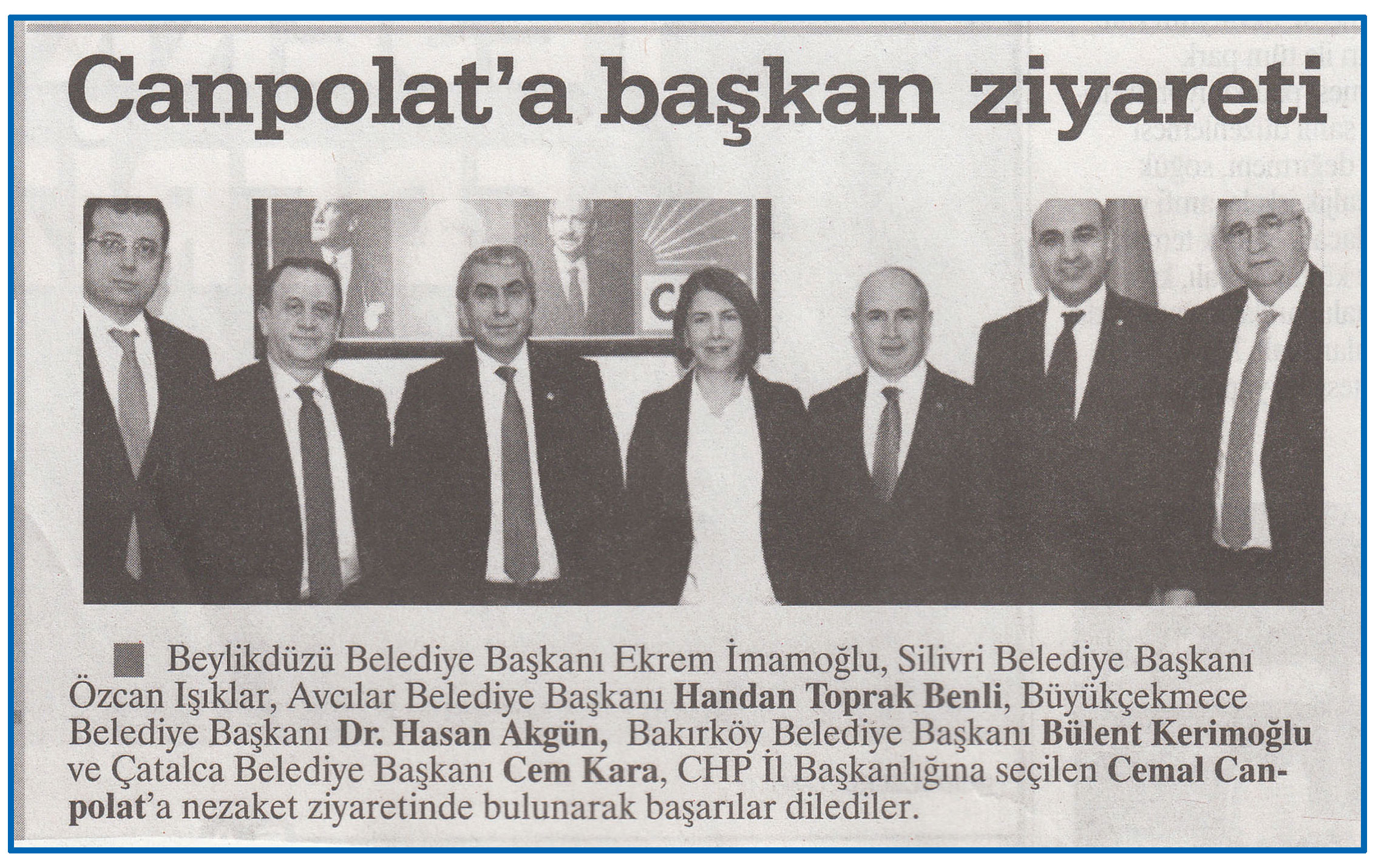 14 Ocak 2016 tarihli "DURUM" gazetesi. Beylikdüzü, Silivri, Avcılar, Büyükçekmece, Bakırköy, Çatalca Belediye Başkanları, CHP İl Başkanlığına seçilen Cemal Canpolat'a nezaket ziyaretinde bulunarak başarılar dilediler.