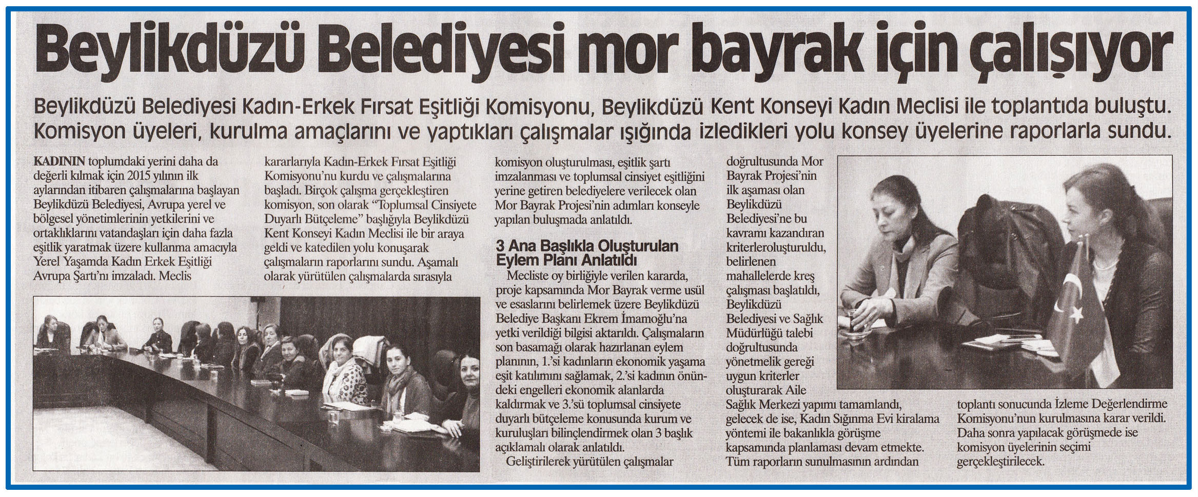 14 Ocak 2016 tarihli "HABER EKSPRESS"Beylikdüzü Belediyesi Kadın-Erkek Fırsat Eşitliğ Komisyonu, Beylikdüzü Kent Kadın Meclisi ile toplantıda buluştu. Komisyon üyeleri, kuulma amaçlarını ve yaptıkları çalışmalar ışığında izledikleri yolu konsey üyelerine raporlarla sundu.