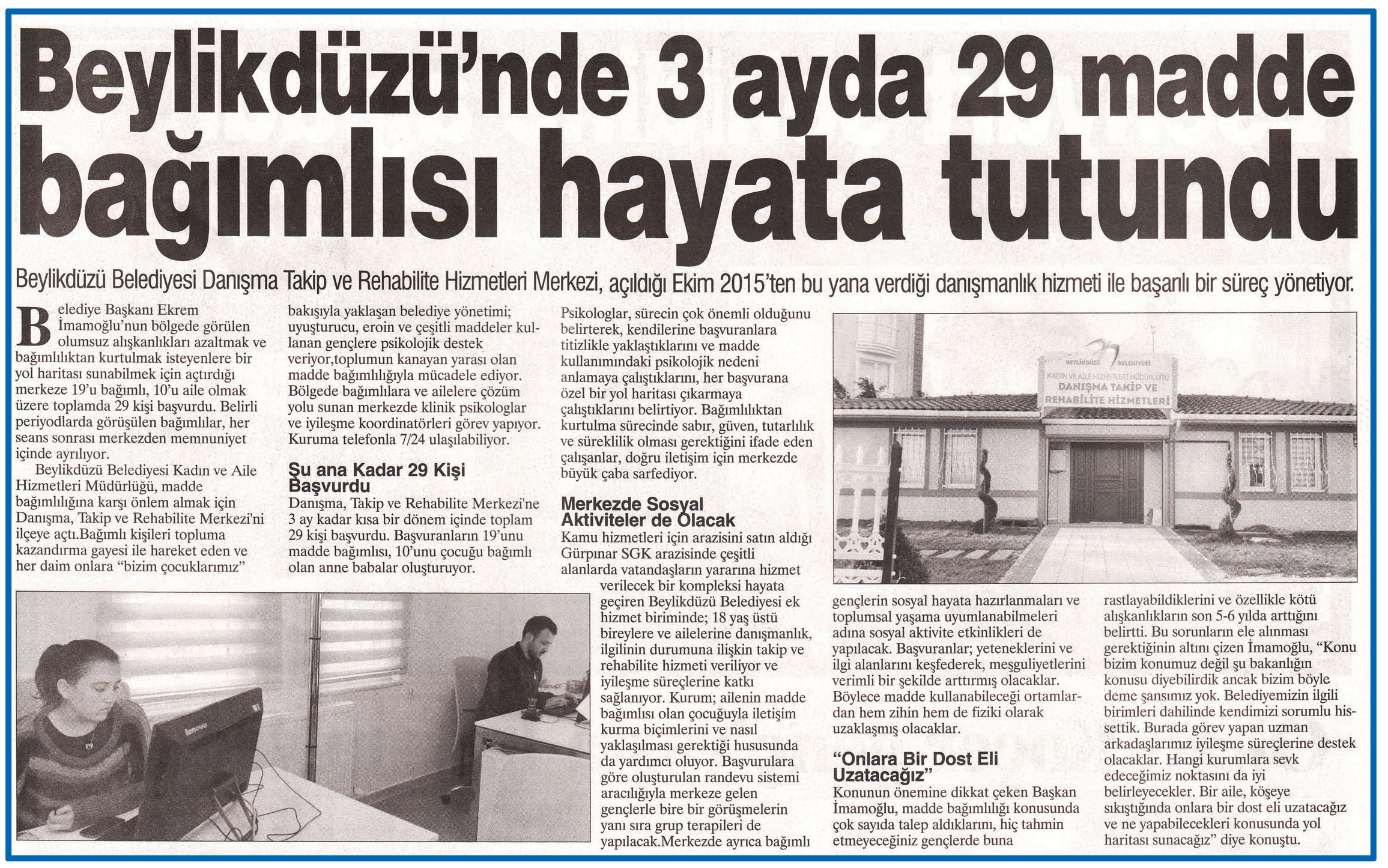 14 Ocak 2016 tarihli "KENT HABER" gazetesi. Beylikdüzü Belediyesi Danışma Takip ve Rehabilite Hizmetleri Merkezi, açıldığı Ekim 2015'ten buyana verdiği danışmanlık hizmeti ile başarılı bir süreç yönetiyor.