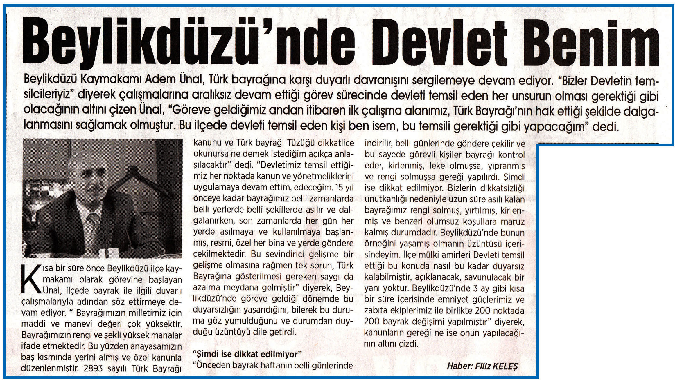 15 Ocak 2016 tarihli "HÜRBAKIŞ" gazetesi. Beylikdüzü Kaymakamı Adem Ünal, Türk bayrağına karı duyarlı davranışını sergilemeye devam ediyor. "Bizler Devletin temsilcileriyiz" diyerek çalışmalarına aralıksız devam ettiği görev sürecinde devleti temsil eden her unsurun olması gerektiği gibi olacağının altını çizen Ünal, "Göreve geldiğimiz andan itibaren ilk çalışma alanımız, Türk Bayrağı'nın hak ettiği şekilde dalgalanmasını sağlamak olmuştur. Bu ilçede devleti temsil eden kişi ben isem, bu temsili gerektiği gibi yapacağım" dedi.