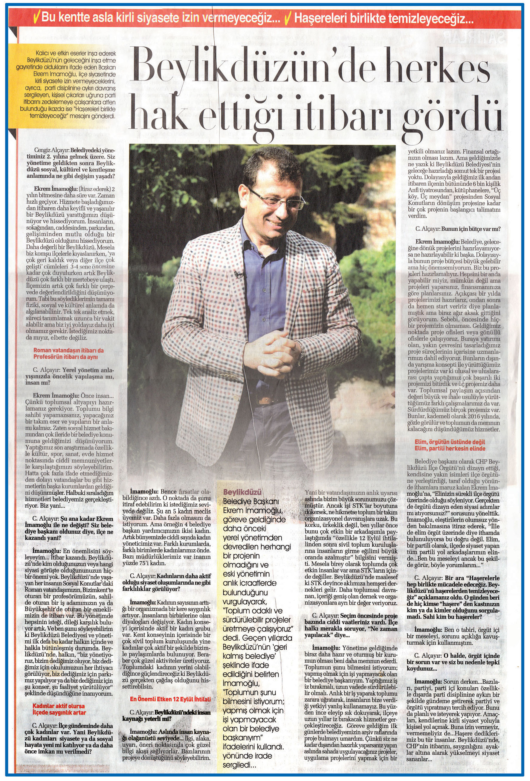 19 Ocak 2016 tarihli "YERELKULİS" gazetesi. Kalıcı ve etkin eserler inşa ederek Beylikdüzü'nün geleceğini inşa etme gayretinde olduklarını ifade eden Başkan Ekrem İmamoğlu, ilçe siyasetinde kirli siyasete izin vermeyeceklerini, ayrıca, parti disiplinine aykırı davranış sergileyen, kişisel çıkarları uğruna parti itibarını zedelemeye çalışanlara atfen bulunduğu ikazda ise "Haşereleri birlikte temizleyeceğiz" mesajını gönderdi.