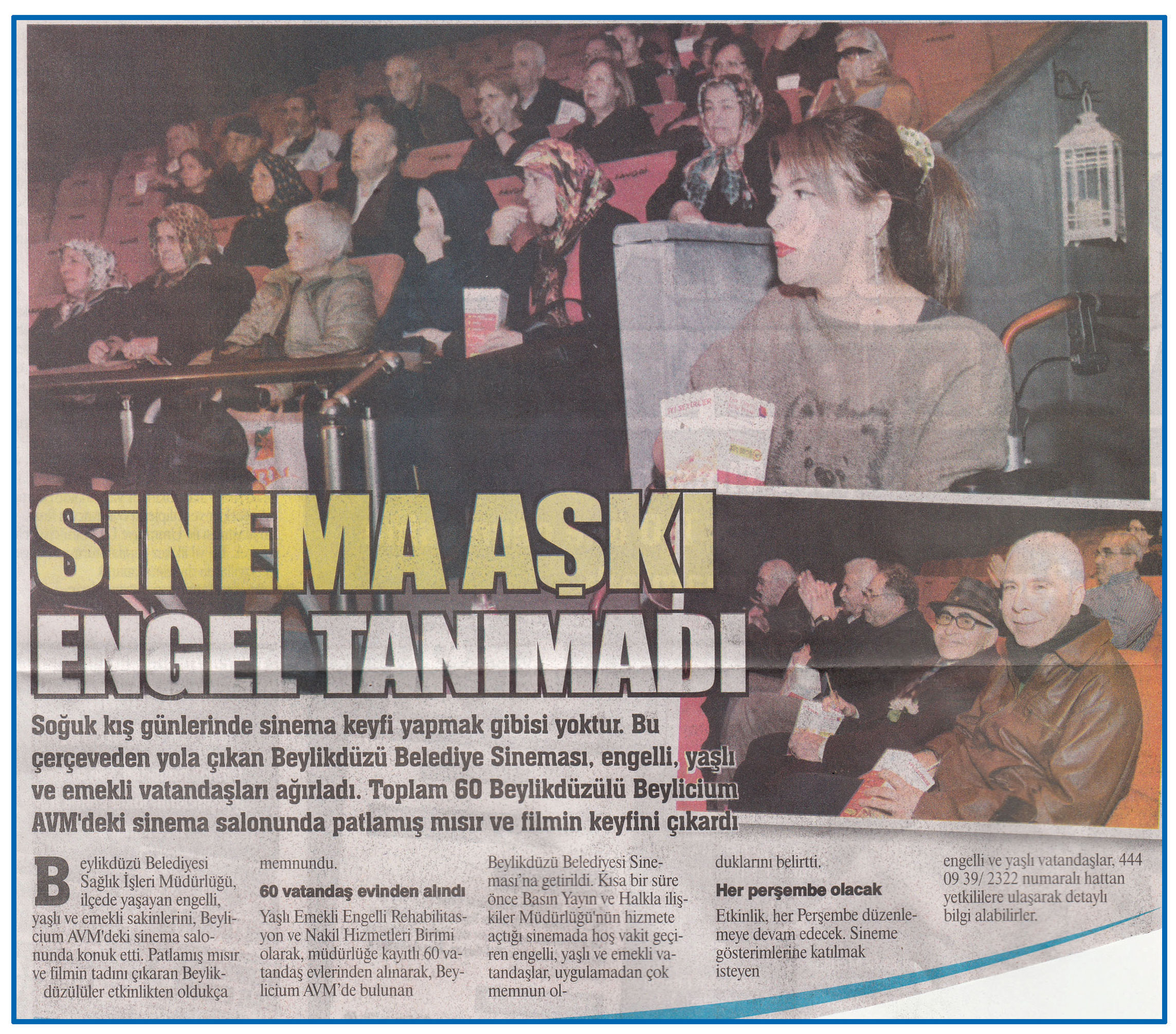 22 Ocak 2016 tarihli "GAZETE İSTANBUL" gazetesi. Soğuk kış günlerinde sinema keyfi yapmak gibisi yoktur. Bu çerçeveden yola çıkan Beylikdüzü Belediye Sineması, engelli, yaşlı ve emekli vatandaşları ağırladı. Toplam 60 Beylikdüzülü Beylicium AVM'deki sinema salonunda patlamış mısır ve filmin keyfini çıkardı.